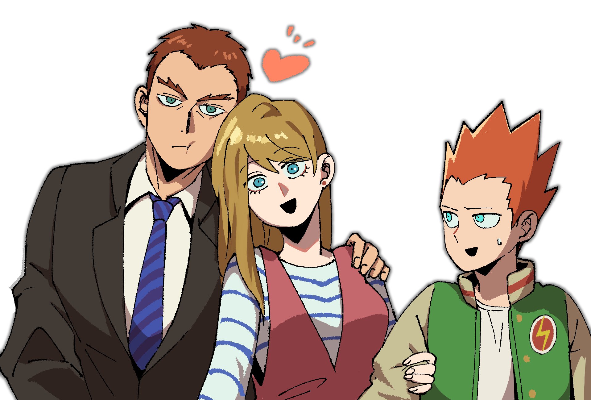 1girl 2boys black_suit blonde_hair blue_eyes blue_necktie brown_hair commentary_request diagonal-striped_clothes diagonal-striped_necktie earrings family father_and_child father_and_son formal_clothes green_jacket heart highres husband_and_wife jacket jewelry leaning_on_person letterman_jacket mob_psycho_100 mother_and_child mother_and_son multiple_boys necktie open_mouth orange_hair parent_and_child r.n shirt smile striped_clothes striped_shirt stud_earrings suit suzuki_shou suzuki_shou's_mother suzuki_touichirou sweatdrop
