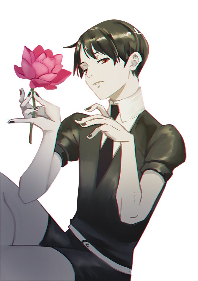 1boy ajin_(sakurai_gamon) black_hair chromatic_aberration commentary_request cosplay flower gem_uniform_(houseki_no_kuni) greyscale houseki_no_kuni male_focus monochrome nagai_kei necktie pink_flower pink_rose profile puffy_short_sleeves puffy_sleeves r.n red_eyes rose short_shorts short_sleeves shorts solo spot_color