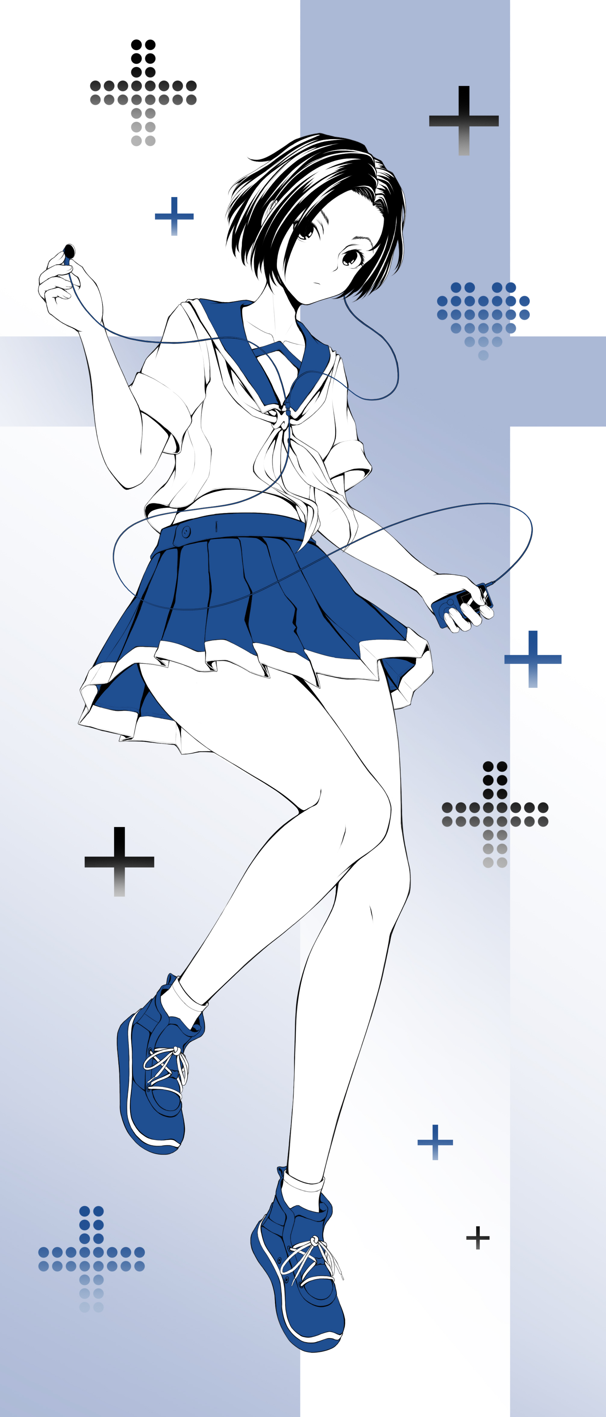 1girl absurdres black_eyes black_hair bob_cut breasts cable closed_mouth cloud_(1301146185) mp3_player earbuds earphones full_body hair_over_one_eye hand_up highres holding holding_earphones kobayakawa_rinko looking_at_viewer love_plus monochrome neckerchief parted_bangs pleated_skirt plus_sign sailor_collar school_uniform serafuku shoelaces shoes short_sleeves simple_background single_earphone_removed skirt small_breasts sneakers socks solo walkman white_socks