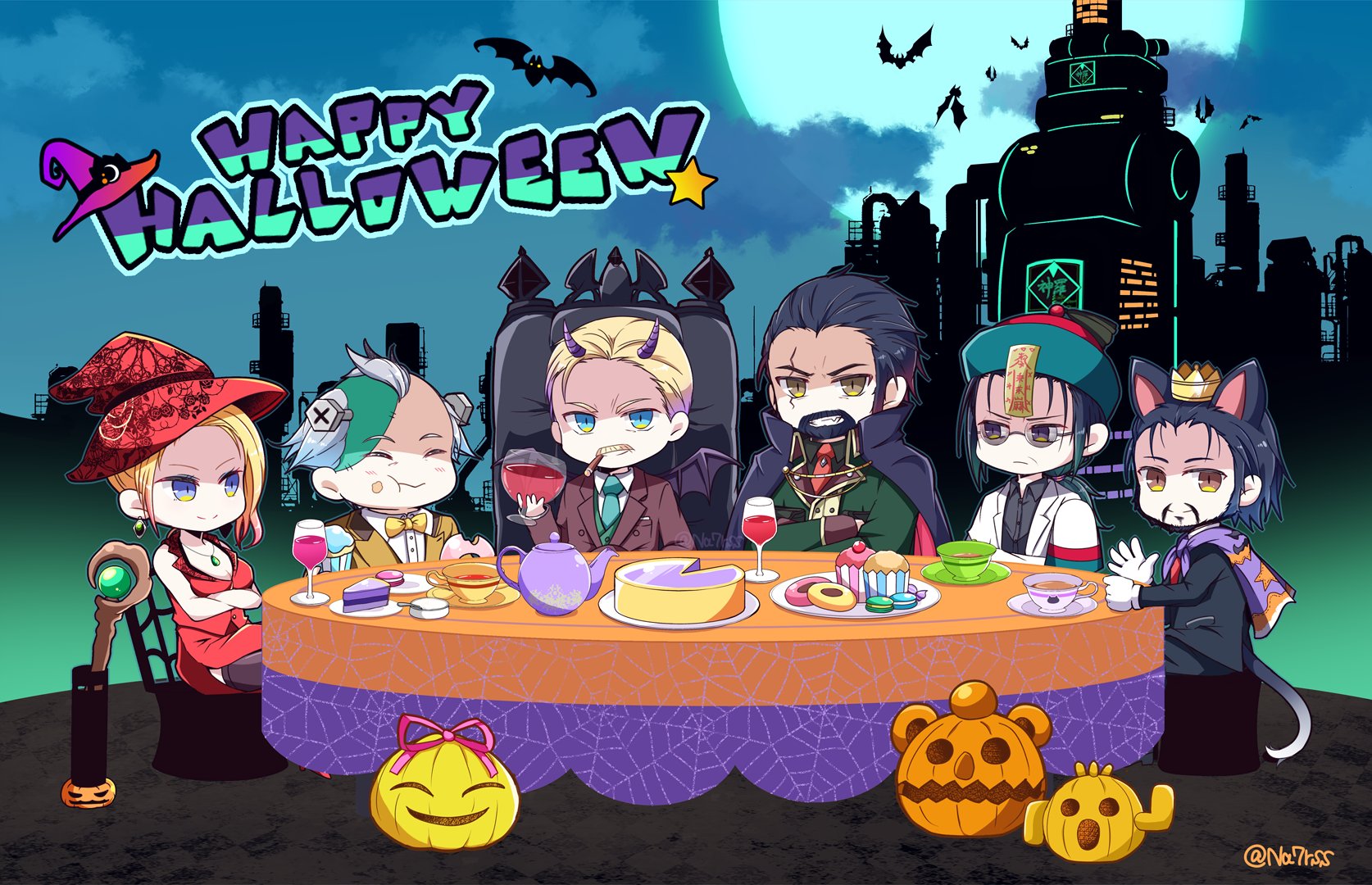 1girl alcohol animal_ears bat_(animal) black_hair cat_ears cat_tail chibi chibi_only cloak commentary_request cup demon_horns demon_tail final_fantasy final_fantasy_vii final_fantasy_vii_remake food frankenstein's_monster frankenstein's_monster_costume glasses grey_hair halloween halloween_costume happy_halloween hat heidegger_(final_fantasy) highres holding holding_cup horns jiangshi_costume lab_coat long_hair low_ponytail male_focus moogle multiple_boys nanao_(zonzonsh) night palmer_(ff7) ponytail president_shinra professor_hojo pumpkin reeve_tuesti sabotender scarlet_(ff7) short_hair sky tail tea vampire_costume wine witch witch_hat