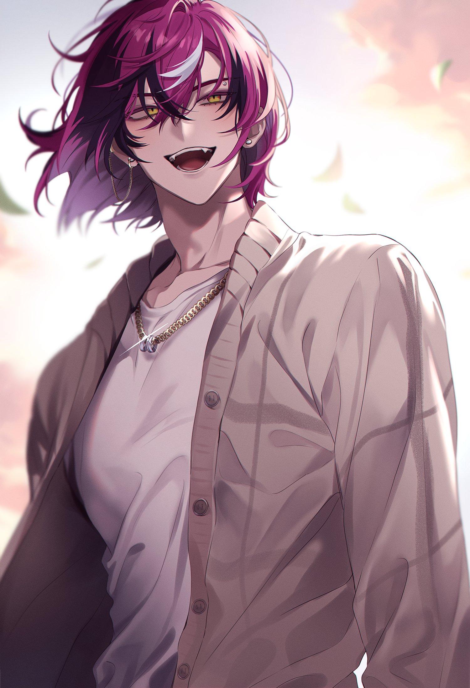 1boy brown_cardigan cardigan cloud collarbone cowboy_shot crew_neck doppio_dropscythe ear_piercing earrings eyebrow_piercing face_piercing falling_leaves fangs floating_hair hair_between_eyes highres jewelry leaf long_sleeves looking_to_the_side male_focus multicolored_hair necklace nijisanji nijisanji_en open_cardigan open_clothes open_mouth owo_renren piercing purple_hair shirt sideways_glance solo sparkle streaked_hair stud_earrings t-shirt teeth tongue triangle_mouth upper_teeth_only virtual_youtuber white_shirt yellow_eyes