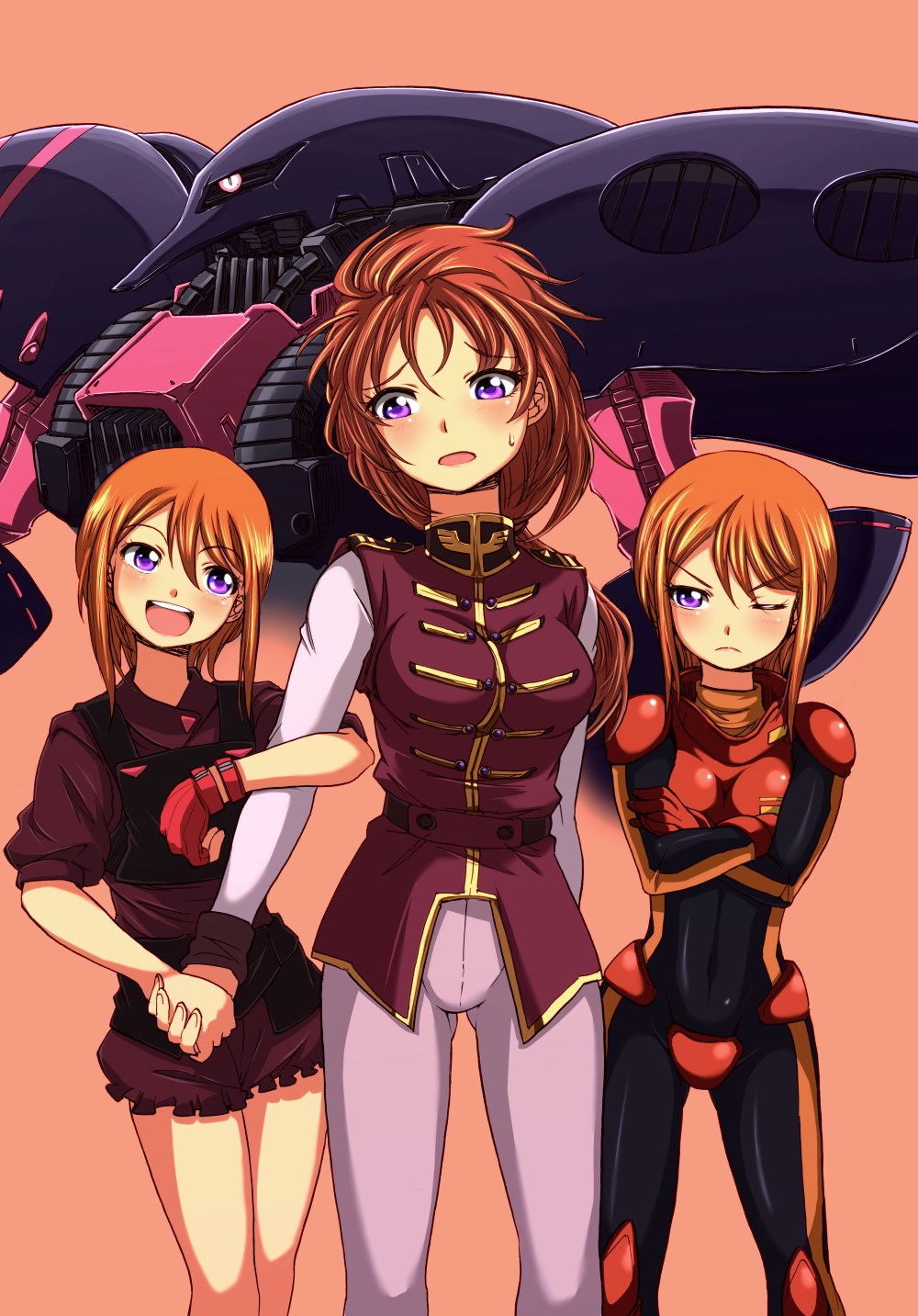 3girls bodysuit crossed_arms elpeo_puru gundam gundam_unicorn gundam_zz highres holding_hands marida_cruz mecha military_uniform multiple_girls purple_eyes puru_two qubeley_mk_ii robot siblings sisters zatou_(kirsakizato)