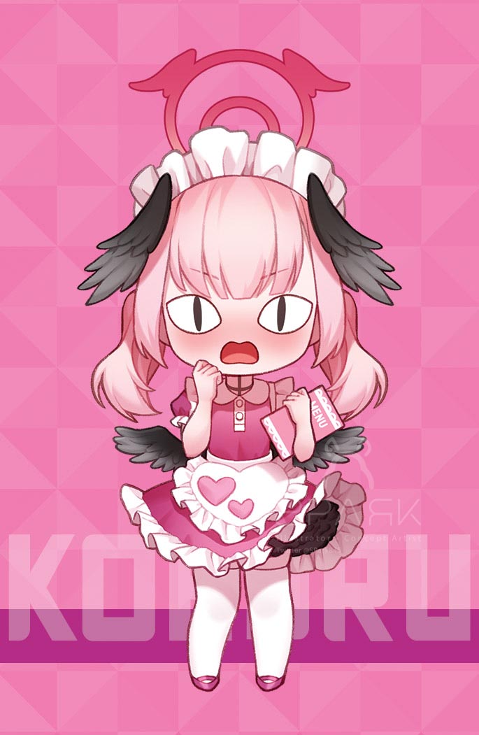 <|>_<|> 1girl apron black_wings blue_archive blush character_name chibi dress frilled_apron frills full_body halo head_wings heart_apron holding holding_menu koharu_(blue_archive) maid_headdress menu open_mouth pink_dress pink_eyes pink_halo pink_shoes pink_theme puffy_short_sleeves puffy_sleeves shoes short_sleeves solo spark_(spark845) standing thighhighs tongue waist_apron watermark white_thighhighs wings