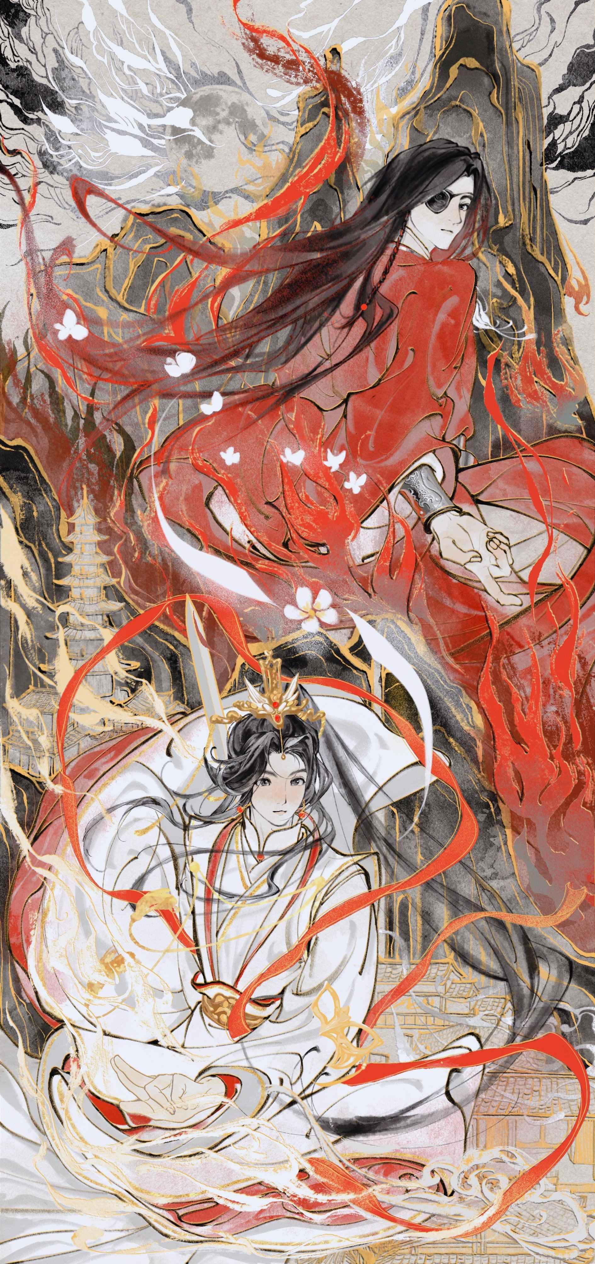 2boys absurdres architecture black_hair bracer braid bug building butterfly chinese_clothes closed_mouth earrings east_asian_architecture energy eyepatch fire flower full_moon grey_eyes hanfu highres holding holding_sword holding_weapon hua_cheng insect jewelry jian_(weapon) long_hair long_sleeves looking_ahead looking_at_viewer mask moon mountain multiple_boys pagoda red_hanfu sash sword tianguan_cifu unworn_mask upper_body weapon white_flower white_hanfu wide_sleeves wuyi1031 xiao_guan_(headdress) xie_lian xie_lian_(flower_crowned_martial_god)