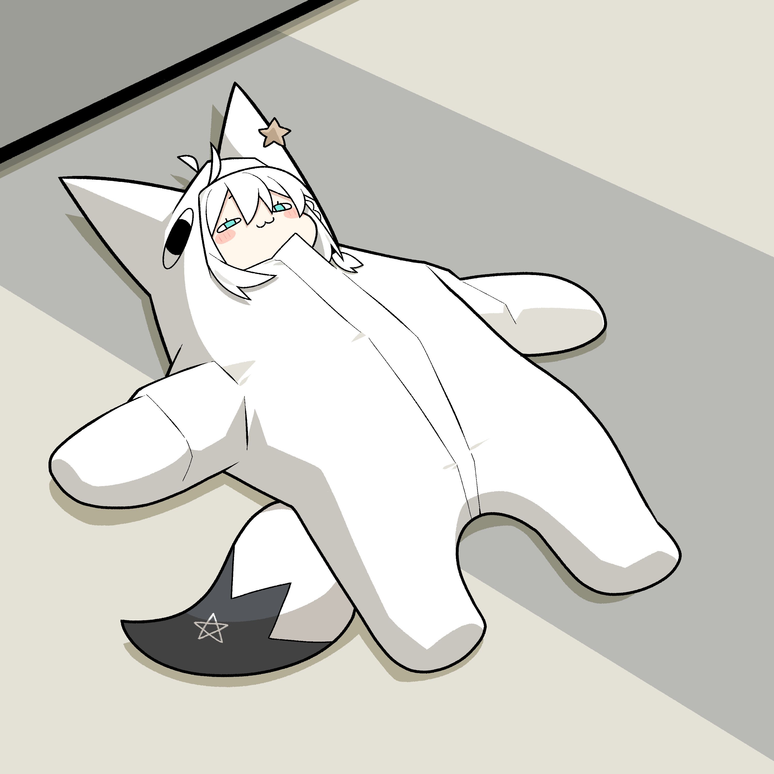 1girl :3 absurdres ahoge aqua_eyes blush cocomayo29_(tomato) commentary_request cosplay floor fox_girl fox_tail full_body highres hololive kigurumi korean_commentary lying on_back on_floor shirakami_fubuki solo tail virtual_youtuber white_hair