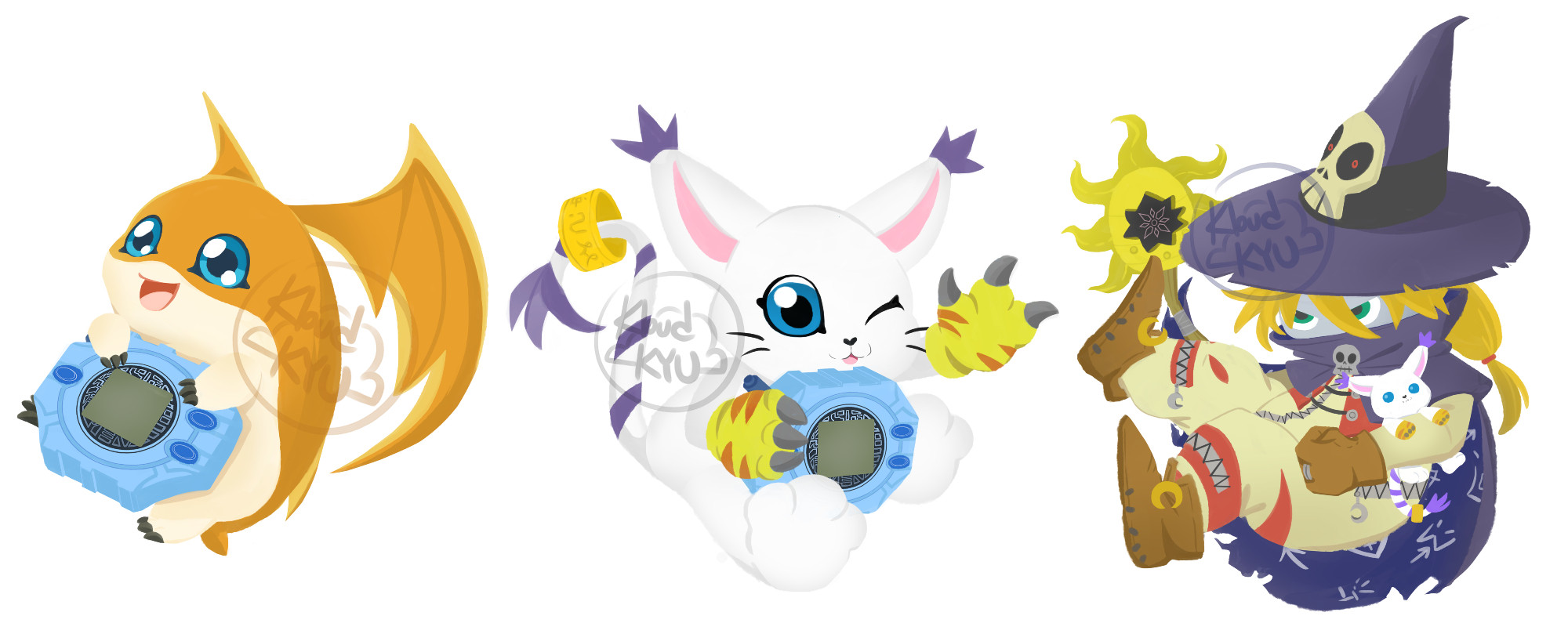 animal_ears cat cat_ears digimon digimon_(creature) digimon_adventure digivice gloves hat highres holy_ring patamon skull tail tailmon wizard wizard_hat wizarmon