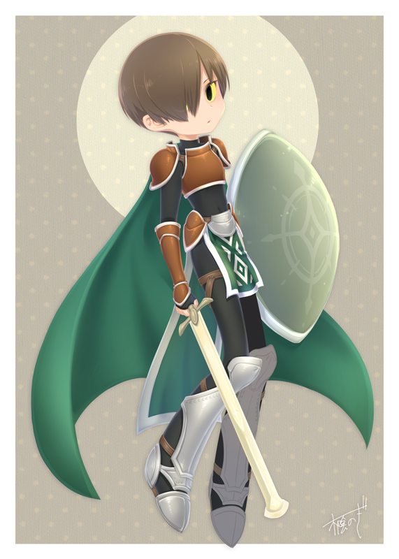 1boy aqua_cape armor black_bodysuit bodysuit border breastplate brown_armor brown_eyes brown_hair cape colored_sclera defender_(elona) elona greaves hair_over_one_eye holding holding_shield holding_sword holding_weapon kokage_nogi male_focus shield short_hair shoulder_armor signature solo sword vambraces weapon white_border yellow_sclera