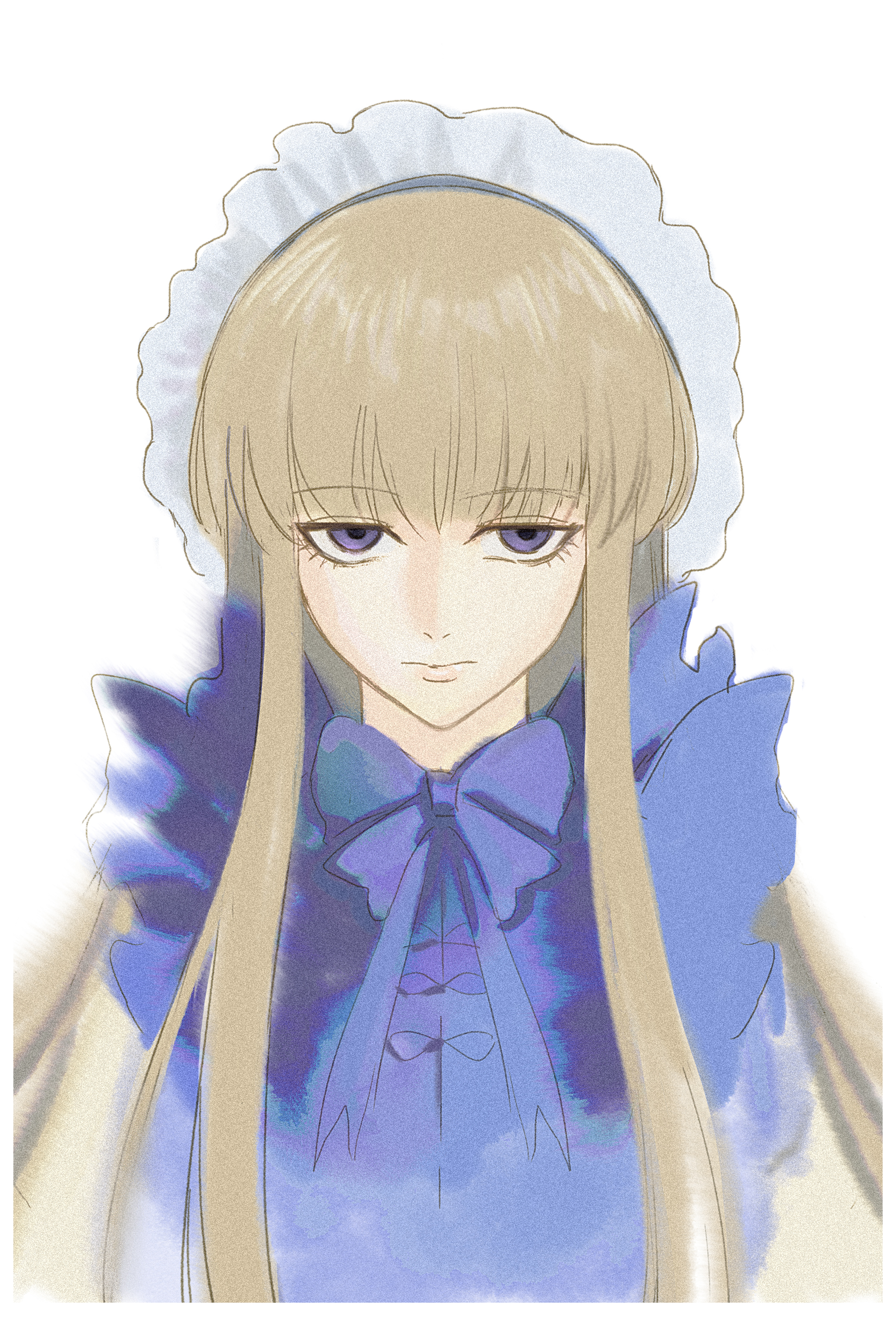 1girl absurdres alice_(black_souls) black_souls black_souls_2 blonde_hair blue_bow blue_bowtie blue_dress blue_eyes bow bowtie closed_mouth doll_alice_(black_souls) dress hairband highres lolita_hairband long_hair portrait sidelocks simple_background sio2_(whynotkarma) solo very_long_hair white_background