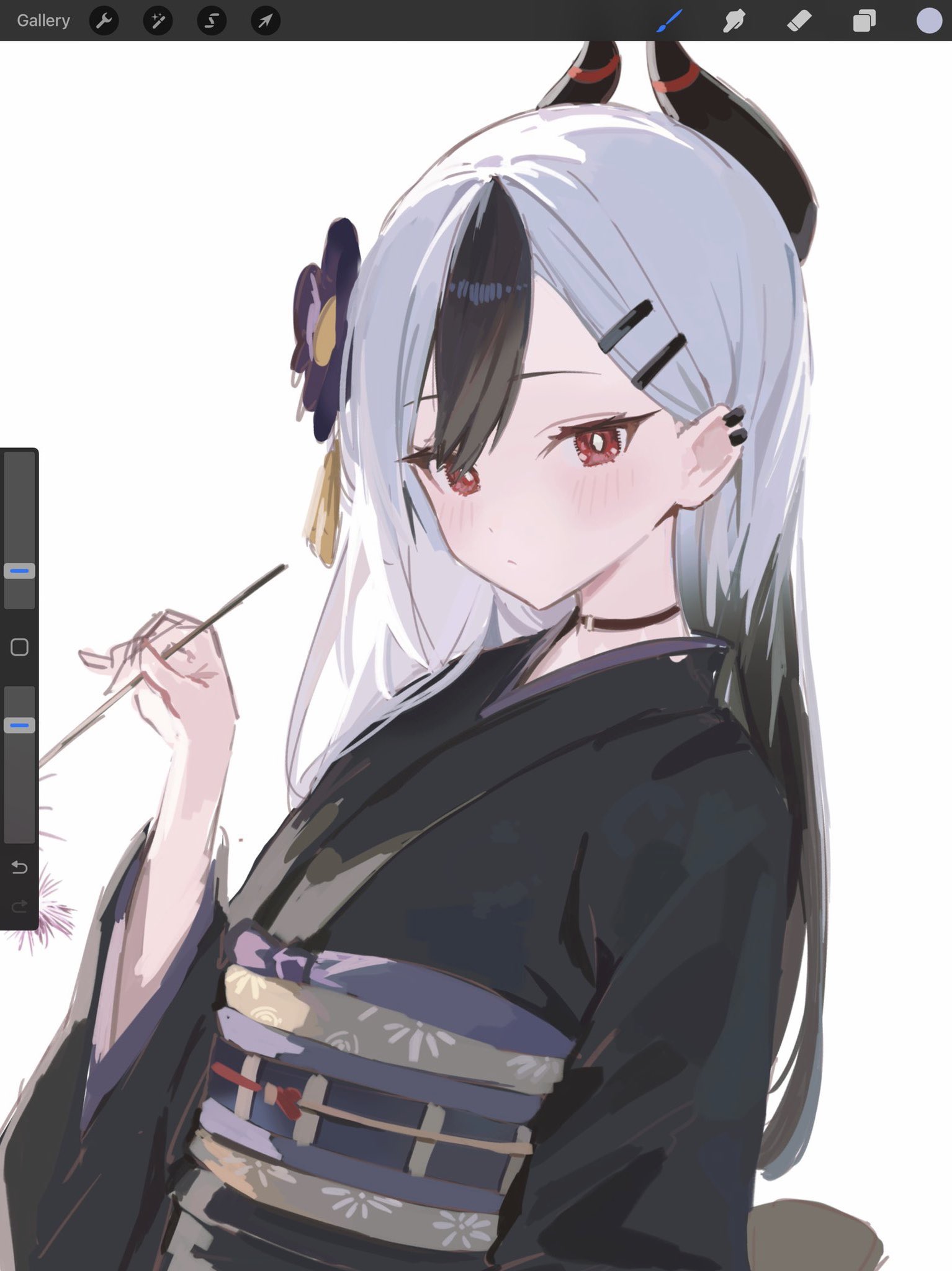 1girl art_program_in_frame bangs_pinned_back black_choker black_hair black_horns black_kimono blue_archive blush bright_pupils choker closed_mouth colored_bangs demon_girl demon_horns ear_piercing hair_behind_ear hair_between_eyes hair_down hair_ornament hairclip highres holding holding_fireworks horns japanese_clothes kayoko_(blue_archive) kayoko_(new_year)_(blue_archive) kimono long_sleeves looking_at_viewer multicolored_hair obi official_alternate_costume official_alternate_hairstyle piercing red_eyes sash simple_background solo soybean_(hisoybean) tassel two-tone_hair unfinished upper_body white_background white_hair white_pupils