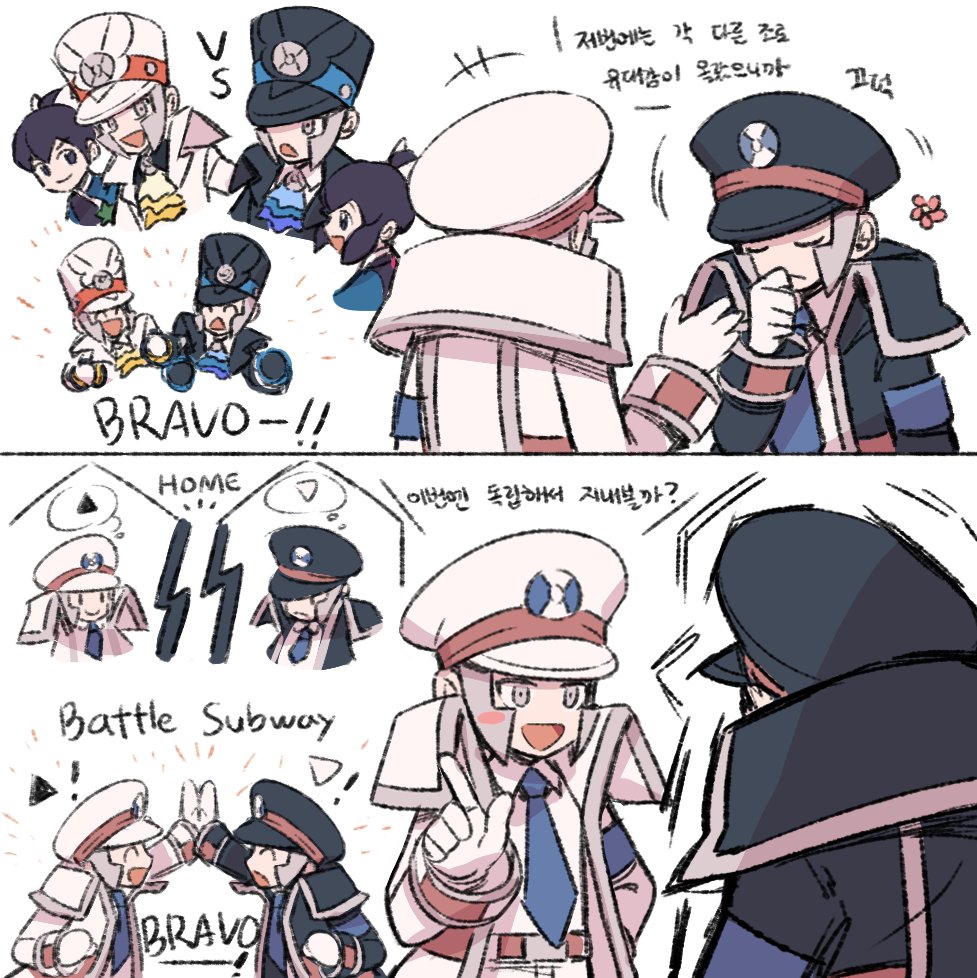 +++ 1girl 3boys :d belt belt_buckle black_coat black_hat blue_necktie brown_belt buckle closed_eyes closed_mouth coat collared_shirt commentary_request emmet_(pokemon) emmet_(sygna_suit)_(pokemon) gloves grey_eyes grey_hair hand_up hat high_five index_finger_raised ingo_(pokemon) ingo_(sygna_suit)_(pokemon) korean_commentary korean_text liza_(pokemon) long_sleeves multiple_boys necktie nintendo official_alternate_costume open_clothes open_coat open_mouth pokemon pokemon_black_and_white pokemon_masters_ex pokemon_omega_ruby_and_alpha_sapphire seku_000 shirt short_hair sideburns smile tate_(pokemon) translation_request white_coat white_gloves white_hat white_shirt