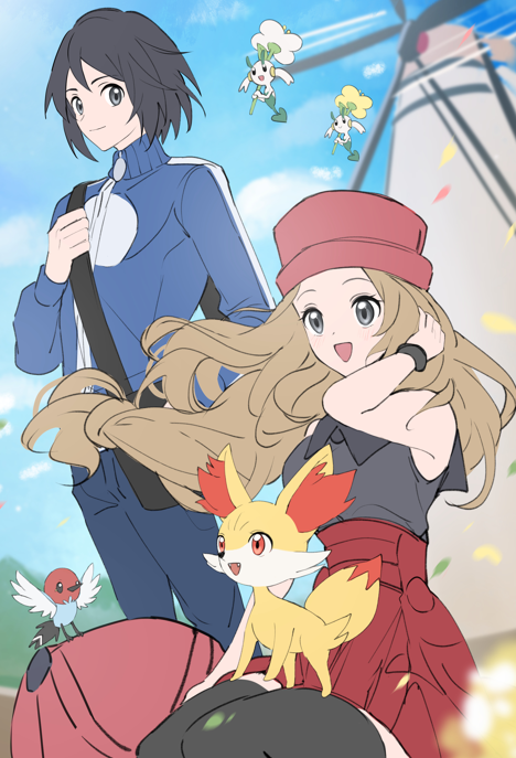 1boy 1girl :d bag black_bag blue_jacket bracelet calem_(pokemon) closed_mouth cloud collared_shirt commentary_request day falling_petals fennekin fletchling floette floette_(white_flower) floette_(yellow_flower) gen_6_pokemon hand_up hat jacket jewelry nintendo open_mouth outdoors pants petals pokemon pokemon_(creature) pokemon_x_and_y red_skirt sakuya_990331 serena_(pokemon) shirt shoulder_bag sitting skirt sky sleeveless sleeveless_shirt smile thighhighs wind_turbine windmill zipper_pull_tab