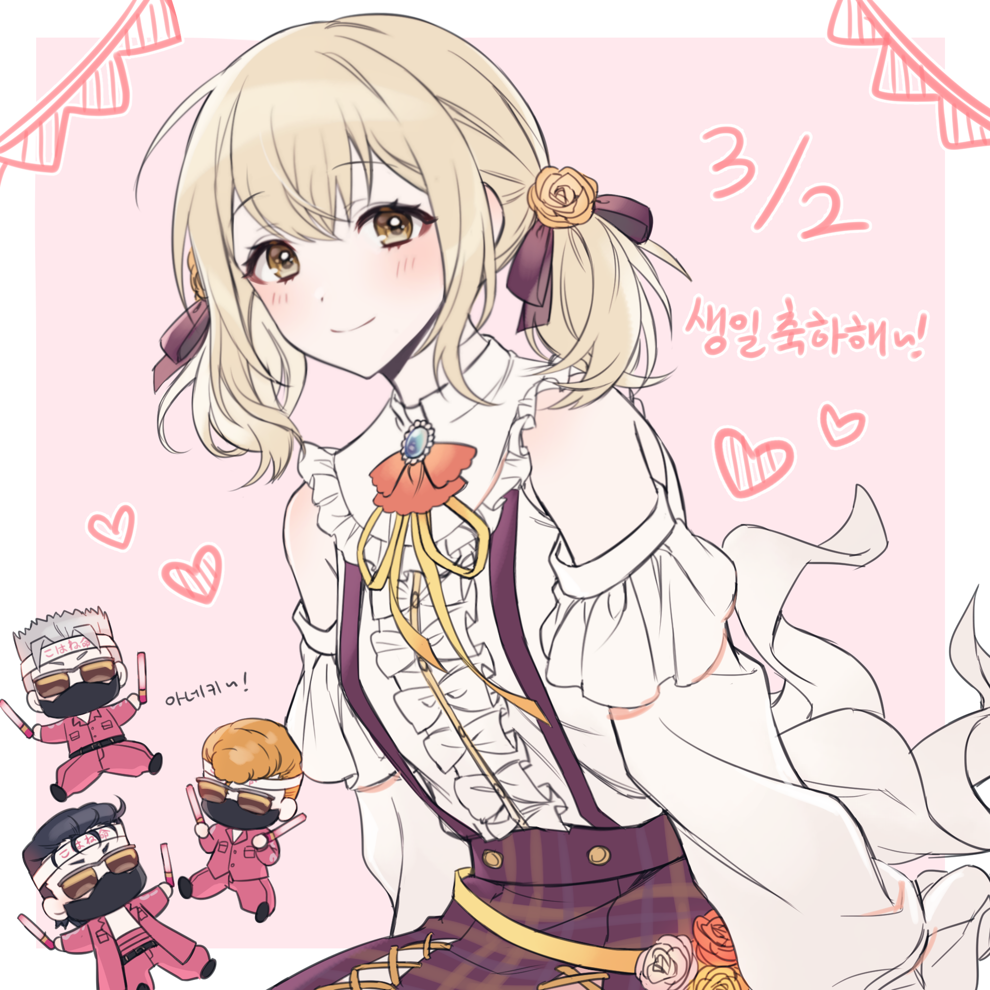 1girl 3boys azusawa_kohane bare_shoulders black_hair blonde_hair blush border bow bowtie brooch brown_eyes brown_hair center_frills chibi detached_sleeves flower frilled_shirt frilled_sleeves frills grey_hair hair_flower hair_ornament hair_ribbon heart highres jacket jewelry kheng_(k_heng1223) long_sleeves looking_at_viewer mask mouth_mask multiple_boys neck_ribbon orange_bow orange_bowtie orange_flower orange_ribbon outside_border pants pink_background plaid_clothes plaid_skirt project_sekai ribbon rose shirt short_twintails sitting skirt smile suspender_skirt suspenders twintails white_border white_shirt white_sleeves yellow_flower yellow_rose