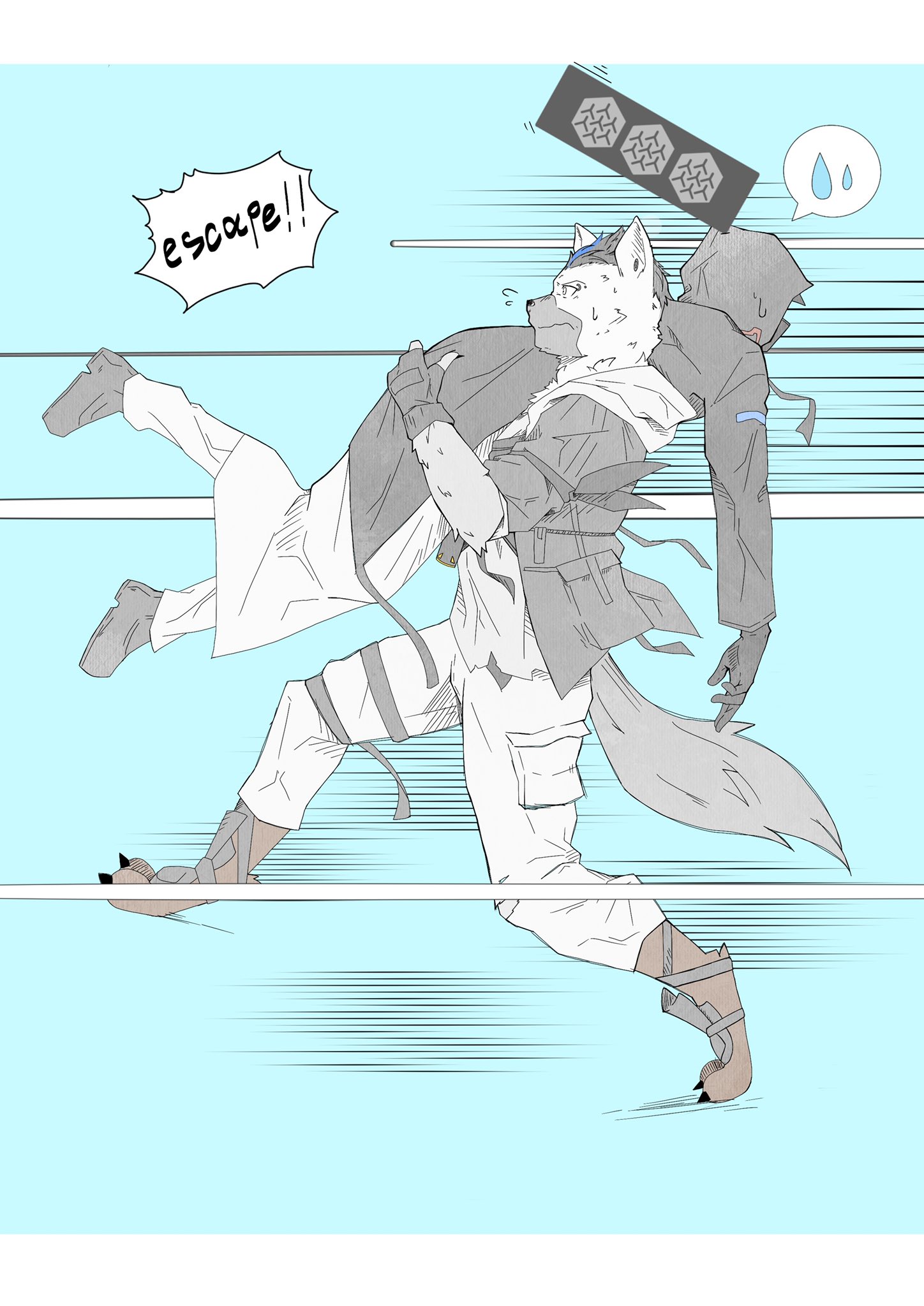 ! !! 2boys arknights black_footwear black_hair black_jacket carrying carrying_over_shoulder carrying_person claws closed_mouth commentary doctor_(arknights) ear_piercing english_text eyebrow_piercing face_piercing fingerless_gloves flying_sweatdrops furry furry_male gloves highres hood hood_down hood_up hyena_boy hyena_ears hyena_tail jacket male_doctor_(arknights) male_focus mask motion_lines mouth_mask multicolored_hair multiple_boys pants piercing running siva_inu24 speech_bubble speed_lines spoken_sweatdrop spot_(arknights) streaked_hair sweatdrop white_pants wide-eyed