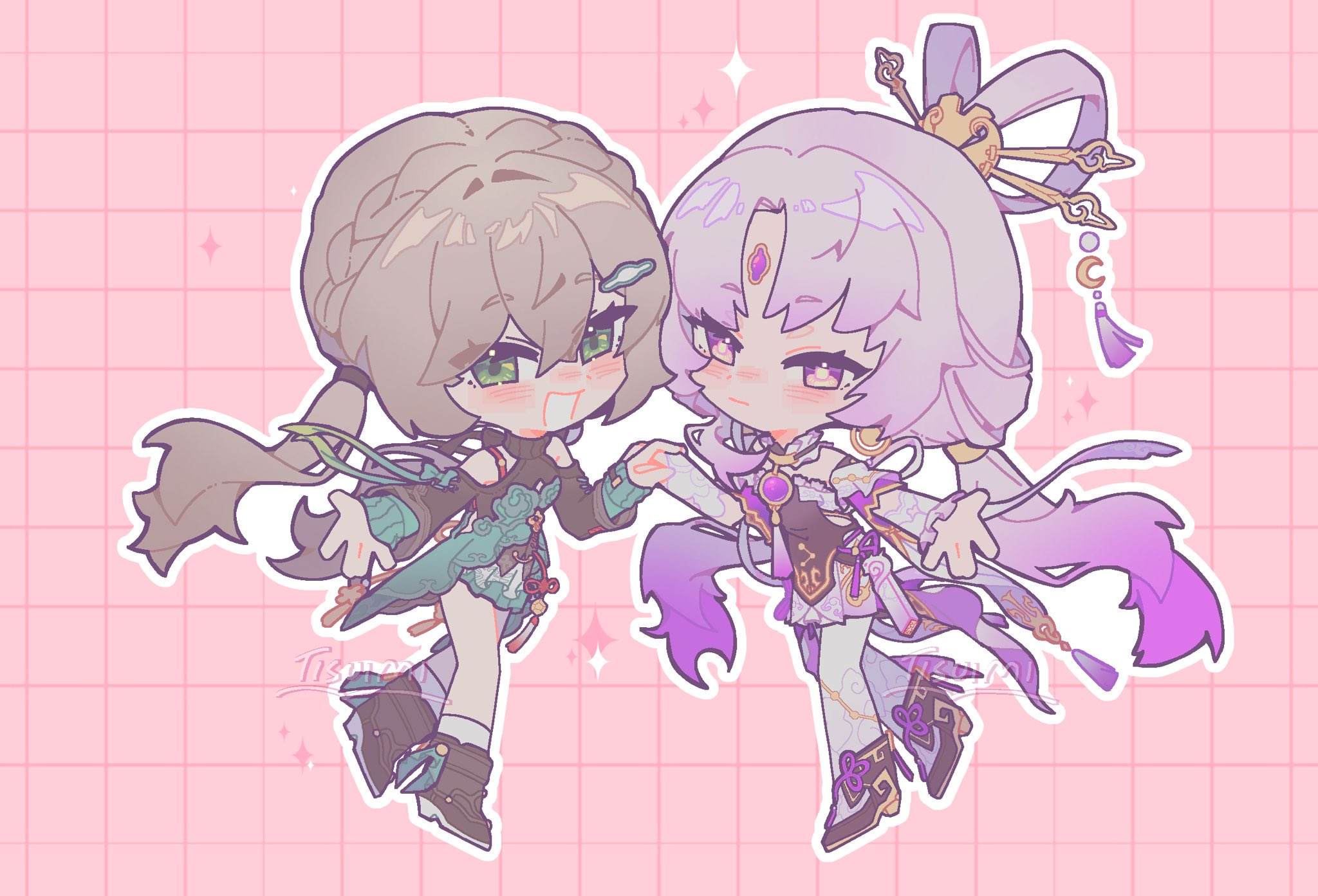 2girls artist_name bare_shoulders blush bow-shaped_hair braid brown_hair chibi chibi_only closed_mouth clothing_cutout commentary crown_braid detached_sleeves dress english_commentary feixianji_(hairstyle) foot_up forehead_jewel fu_xuan_(honkai:_star_rail) green_dress green_eyes grid_background hair_ornament hair_rings hair_stick hairclip highres holding_hands honkai:_star_rail honkai_(series) light_brown_hair long_hair long_sleeves looking_at_viewer low_twintails multiple_girls open_mouth pantyhose parted_bangs pink_background pink_hair qingque_(honkai:_star_rail) reaching reaching_towards_viewer shoulder_cutout shoulder_strap smile suimi_esse tassel tassel_hair_ornament twintails very_long_hair watermark white_pantyhose yellow_eyes