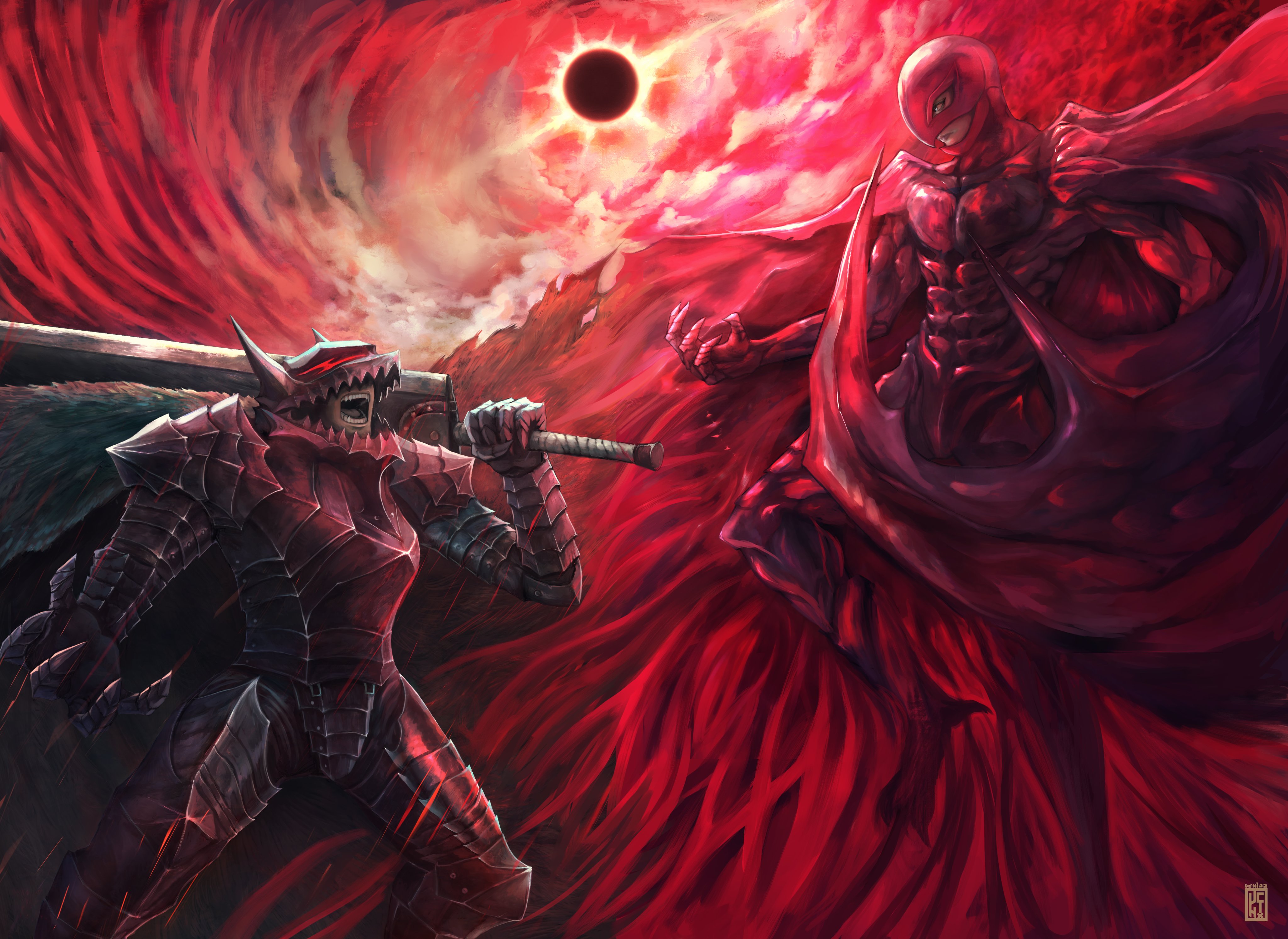 2boys absurdres animal_helmet armor berserk berserker_armor black_armor cape clawed_gauntlets cloud cloudy_sky cuirass dragonslayer_(sword) eclipse femto_(berserk) floating gauntlets greatsword greaves griffith_(berserk) guts_(berserk) helmet highres looking_at_another male_focus multiple_boys open_mouth over_shoulder pauldrons shoulder_armor shouting sky solar_eclipse sword torn_cape torn_clothes uchi_vs_the_world watermark weapon weapon_over_shoulder