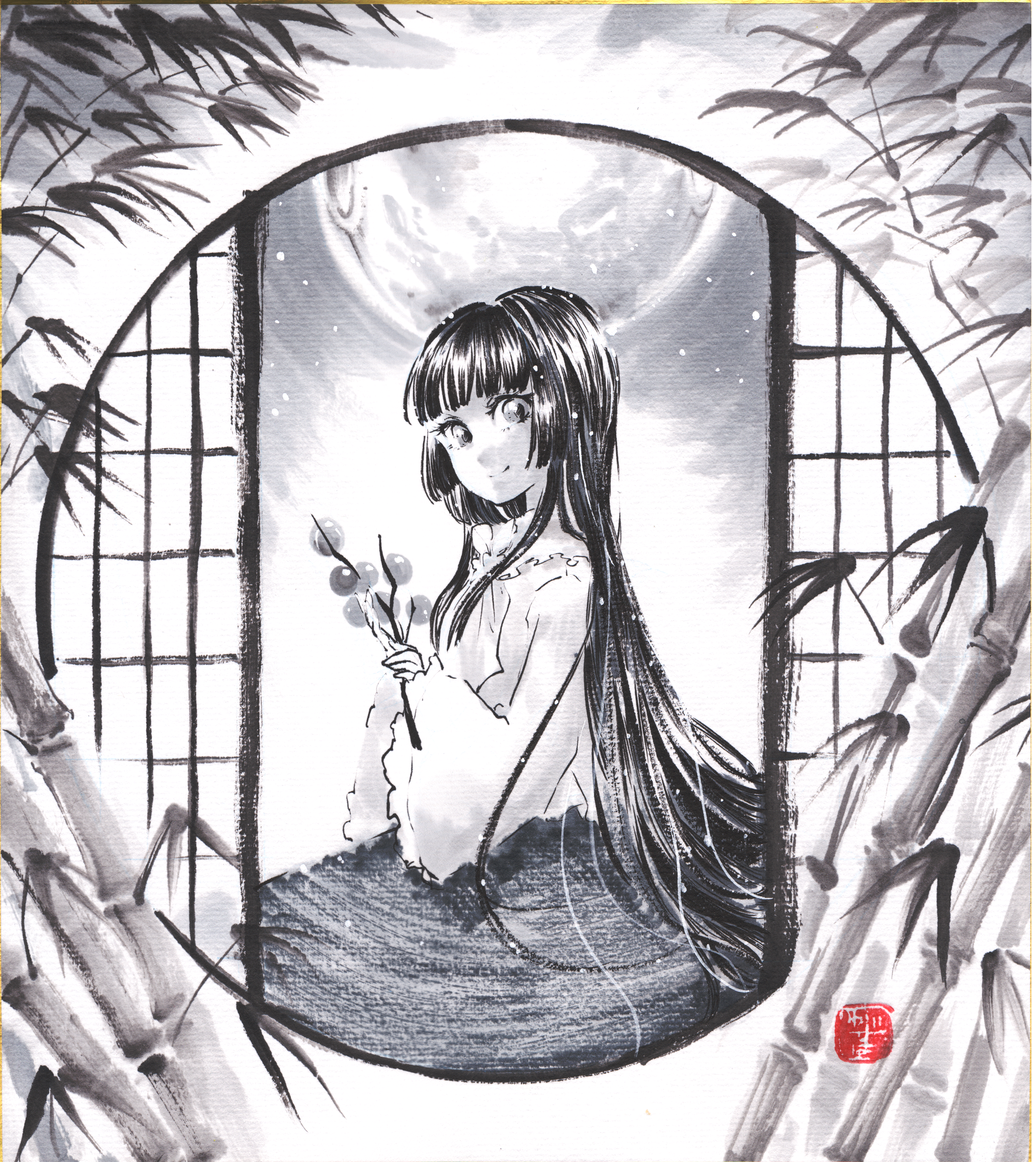 1girl absurdres bamboo blunt_bangs branch closed_mouth from_side full_moon greyscale highres holding holding_branch houraisan_kaguya jeweled_branch_of_hourai light_smile long_hair long_sleeves looking_at_viewer monochrome moon skirt solo touhou very_long_hair wide_sleeves yuzuha_(yuzutime)