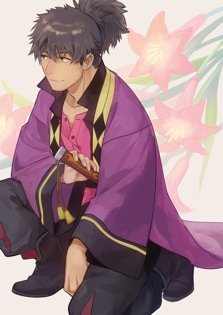 1boy black_boots black_hair black_pants boots coat dark-skinned_male dark_skin facial_hair flower green_eyes hair_between_eyes holding holding_weapon lily_(flower) lirio_(nikori9) long_hair male_focus on_one_knee pants pink_shirt ponytail purple_coat raven_(tales) shirt smile solo stubble tales_of_(series) tales_of_vesperia weapon