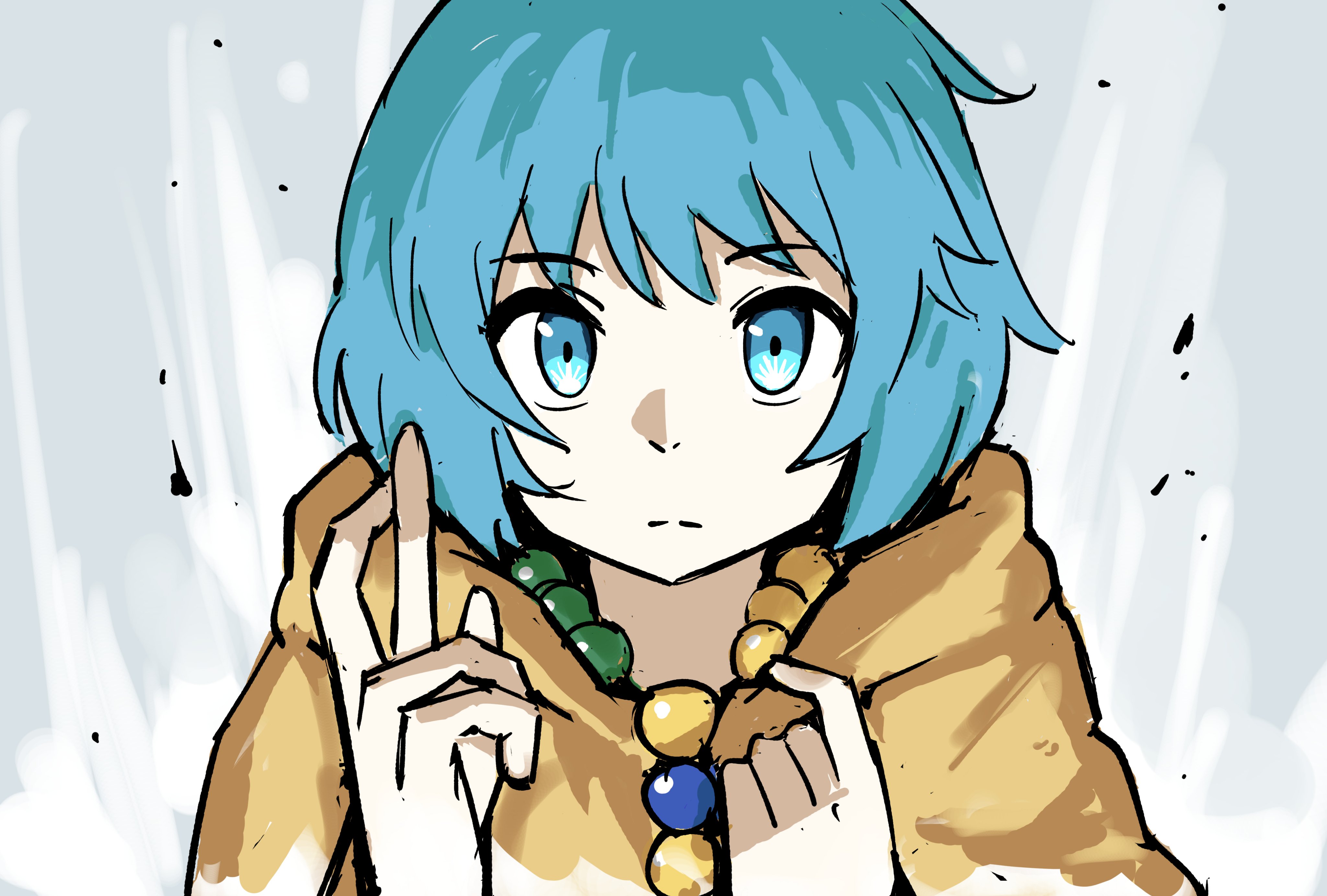 1girl absurdres aqua_eyes aqua_hair bead_necklace beads closed_mouth coat domain_expansion expressionless hands_up highres hood hooded_coat jewelry jubilee_2025 jujutsu_kaisen looking_at_viewer luce_(jubilee_2025) necklace short_hair solo tenten_(chan4545) upper_body yellow_coat