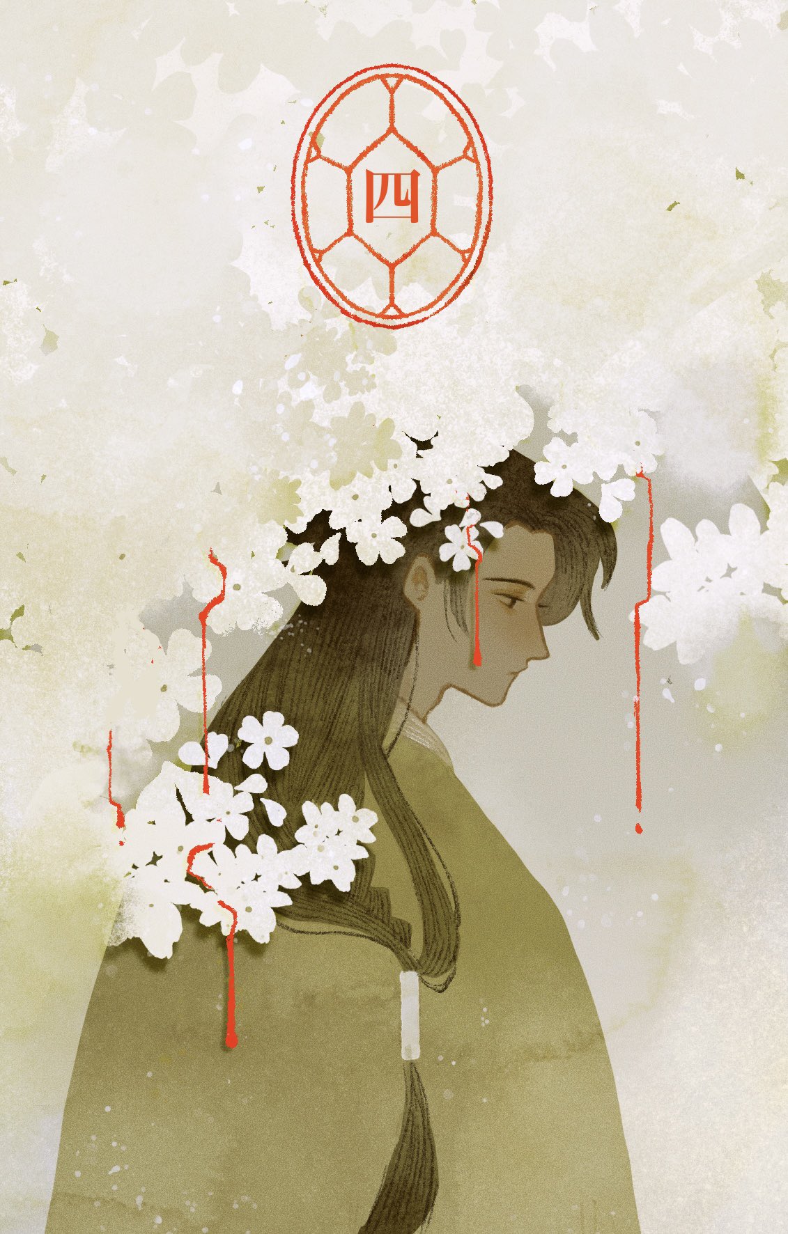 1boy black_hair blood chinese_clothes expressionless flower hanfu highres iplepee long_hair murong_chuyi profile solo white_flower yuwu