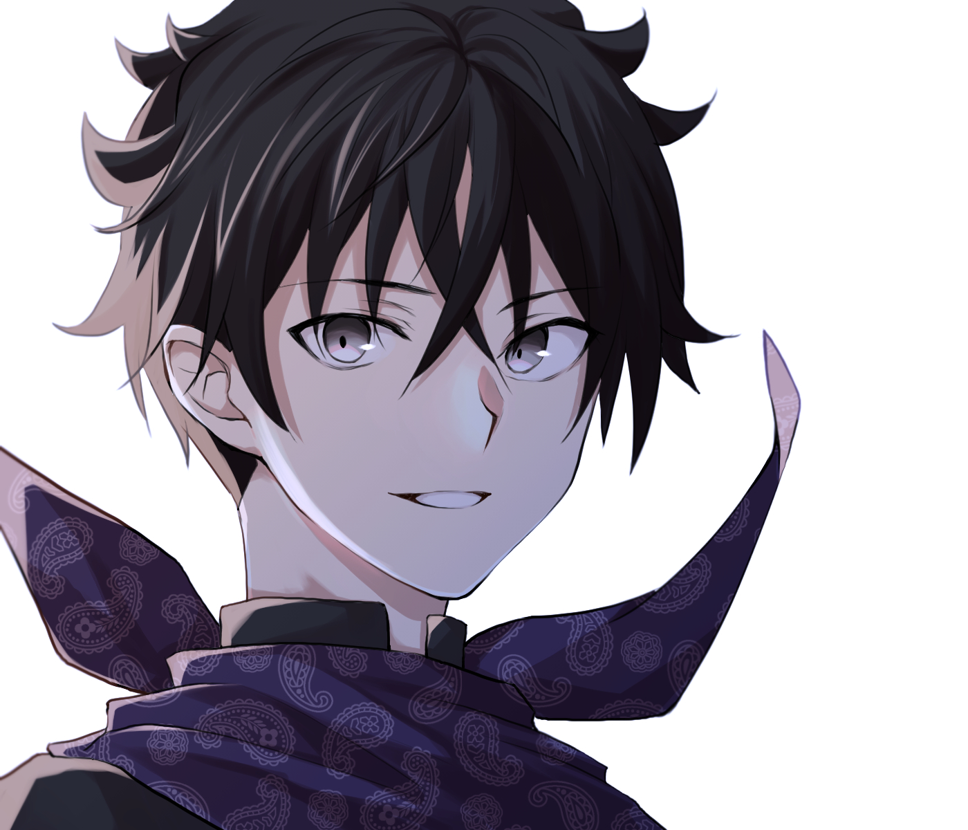 1boy black_hair black_shirt brother_and_sister grey_eyes grin hair_between_eyes highres nakiri_asahi neckerchief portrait purple_neckerchief shirt shokugeki_no_souma short_hair siblings simple_background smile solo teeth toy-black white_background