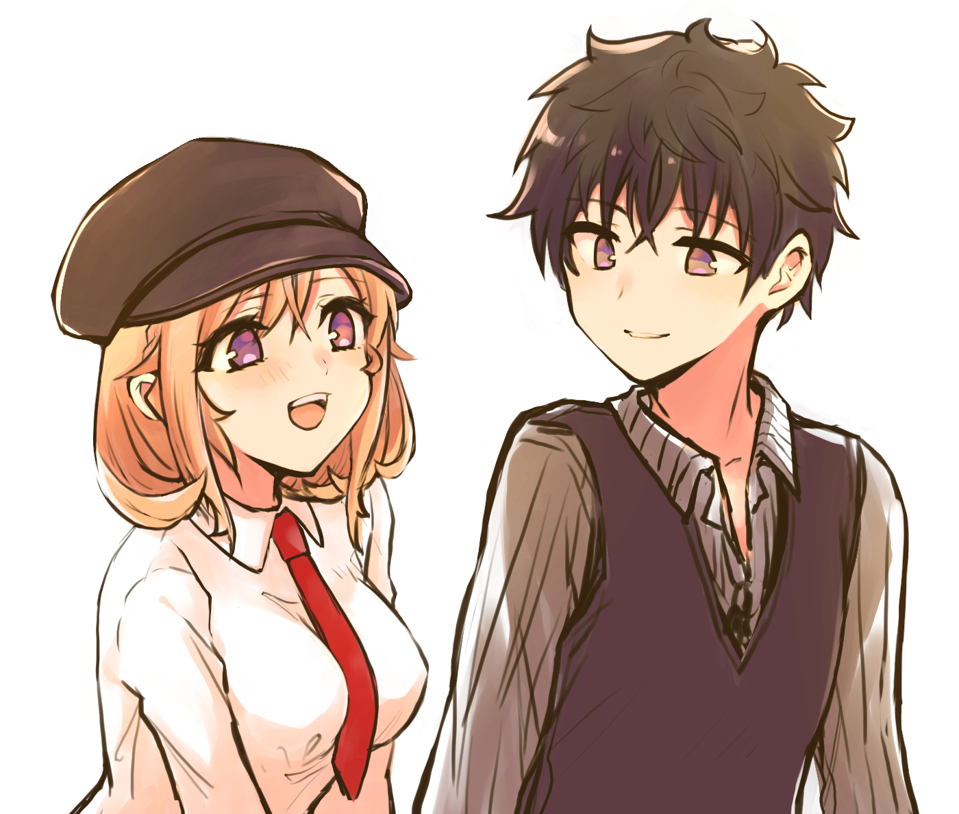 1boy 1girl black_hair black_hat black_vest blonde_hair blush breasts brother_and_sister brown_eyes collared_shirt hat large_breasts looking_at_another male_focus medium_hair nakiri_asahi nakiri_erina necktie red_necktie shirt shokugeki_no_souma short_hair siblings simple_background smile striped_clothes striped_shirt teeth toy-black upper_body upper_teeth_only vest white_background