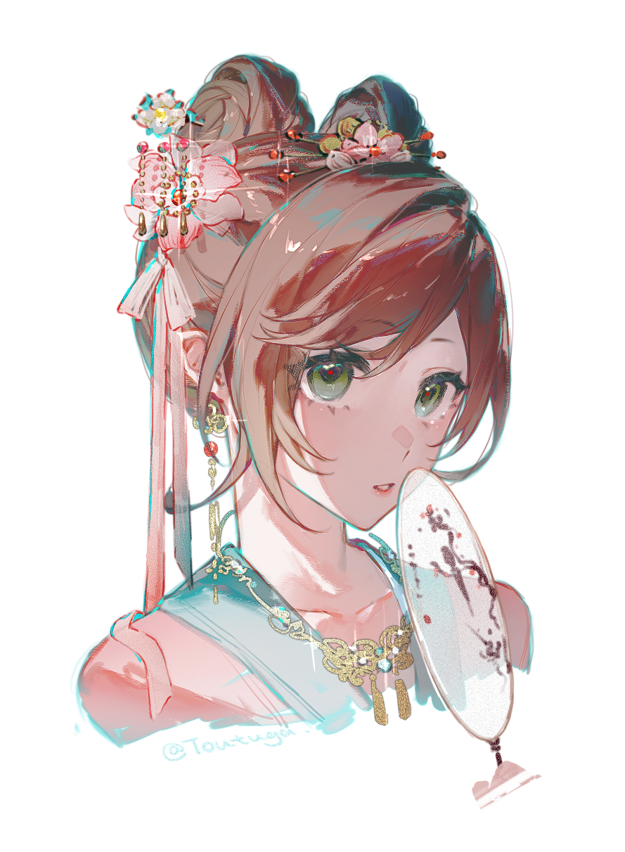 1girl brown_hair chinese_clothes chinese_commentary collarbone commentary_request cropped_shoulders double_bun earrings flower flower_hairpin green_eyes hair_bun hair_flower hair_ornament hairpin hand_fan highres holding holding_fan jewelry looking_to_the_side parted_bangs parted_lips pink_flower rosa_(tears_of_themis) shiguilinga signature simple_background solo tears_of_themis updo white_background