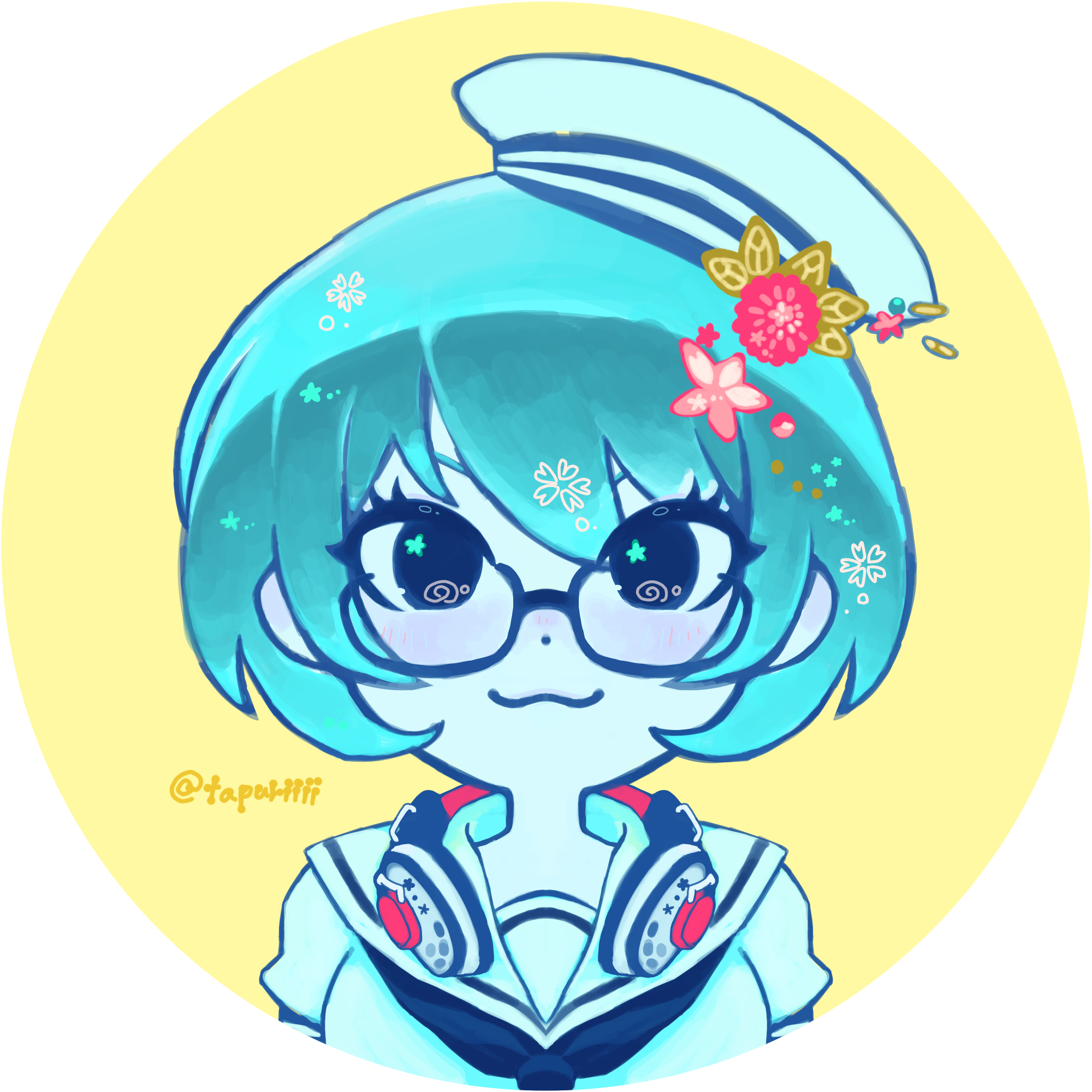 1girl :3 benten_(housamo) blue_hair blue_theme chaba_ga_oishii closed_mouth commentary eyelashes glasses hat headphones headphones_around_neck highres looking_at_viewer round_border sailor_collar sailor_hat short_hair solo tokyo_houkago_summoners twitter_username