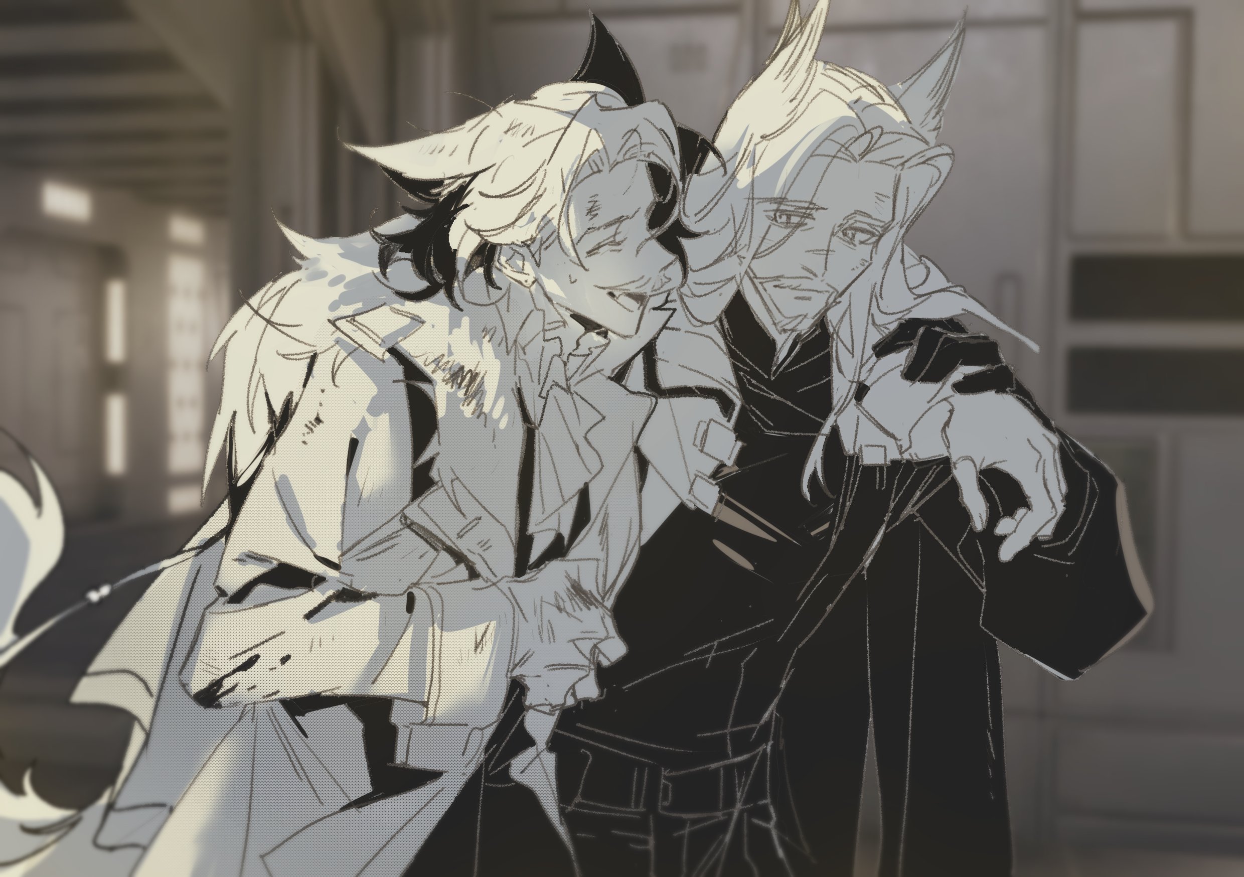 2boys animal_ears arknights arms_around_neck beard cat_boy cat_ears cat_tail chinese_commentary closed_mouth commentary_request facial_hair facing_another greyscale harold_(arknights) hellagur_(arknights) highres looking_at_another male_focus monochrome multiple_boys mustache old old_man open_mouth smile sora_(sora1019) tail