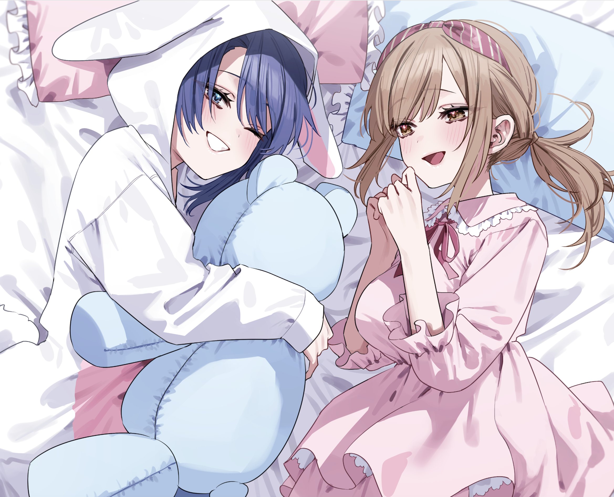 animal_ear_hood blue_eyes blue_hair blush brown_eyes brown_hair chigusa_minori commentary_request dress fake_animal_ears highres himeno_akira hood hood_up jitsuha_imouto_deshita. long_hair long_sleeves lying neck_ribbon official_art on_bed one_eye_closed open_mouth pajamas pillow pink_dress red_ribbon ribbon second-party_source short_hair three-quarter_sleeves sleeves_past_wrists ueda_hinata