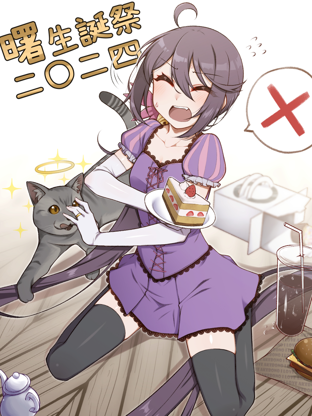 1girl akebono_(kancolle) bell black_thighhighs cat closed_eyes dress elbow_gloves flat_chest flower gloves hair_bell hair_flower hair_ornament highres jewelry jingle_bell kantai_collection long_hair puffy_short_sleeves puffy_sleeves purple_dress purple_hair ring short_dress short_sleeves side_ponytail speech_bubble thighhighs translation_request very_long_hair wedding_ring white_gloves yuki_to_hana