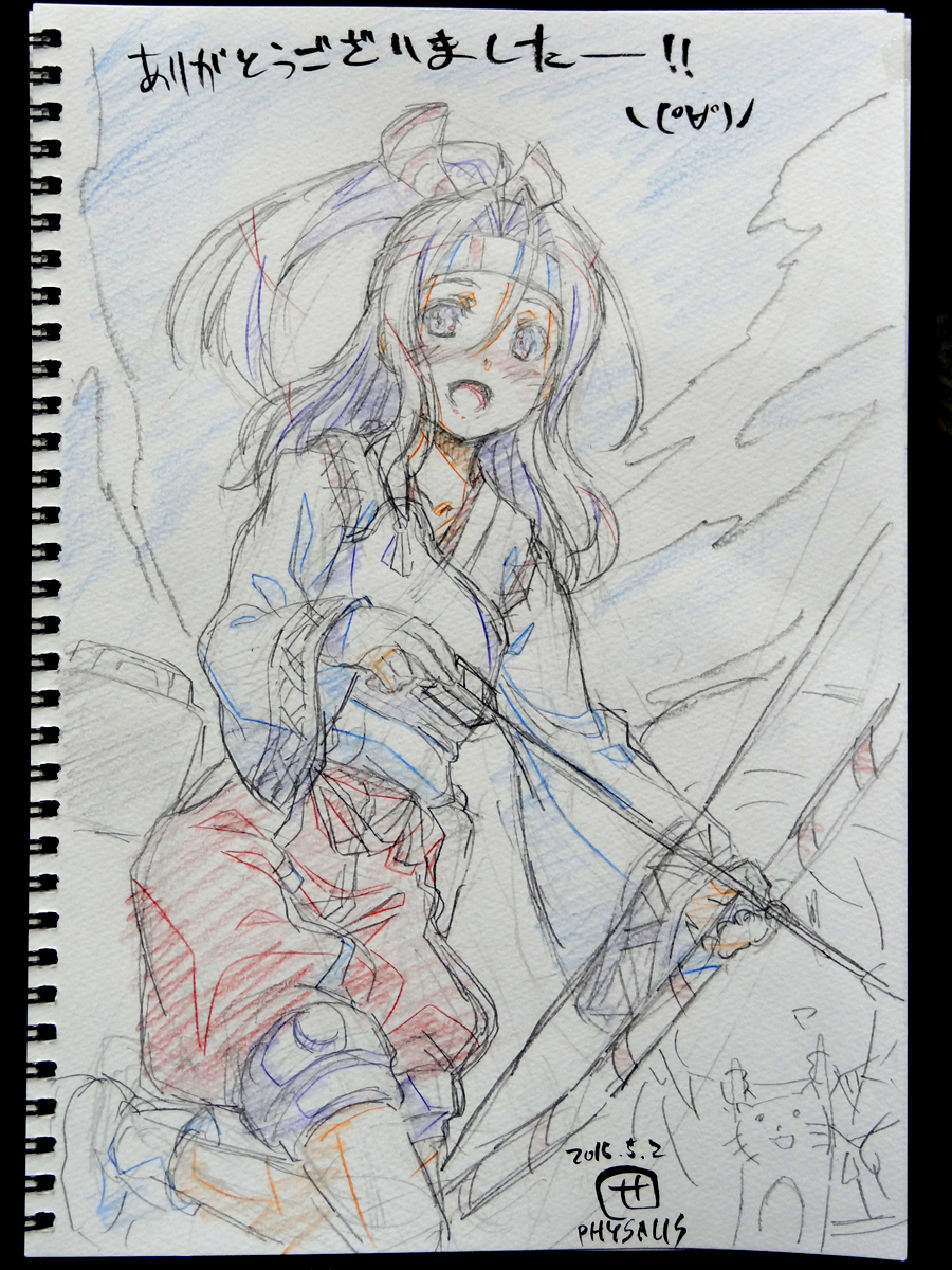 1girl blush bow_(weapon) gloves hachimaki hair_between_eyes headband highres japanese_clothes kantai_collection muneate partially_fingerless_gloves partly_fingerless_gloves ponytail selece sketch solo weapon yugake zuihou_(kancolle)