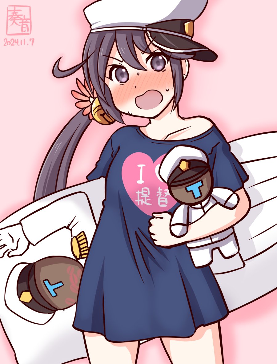 1girl admiral_(kancolle) akebono_(kancolle) alternate_costume artist_logo bell blue_shirt blush clothes_writing collarbone dakimakura_(object) dated doll feet_out_of_frame flower grey_eyes grey_hair hair_bell hair_between_eyes hair_flower hair_ornament hat heart heart_print jingle_bell kanon_(kurogane_knights) kantai_collection logo looking_at_viewer nose_blush one-hour_drawing_challenge open_mouth pillow shirt shitty_admiral_(phrase) side_ponytail simple_background solo white_hat
