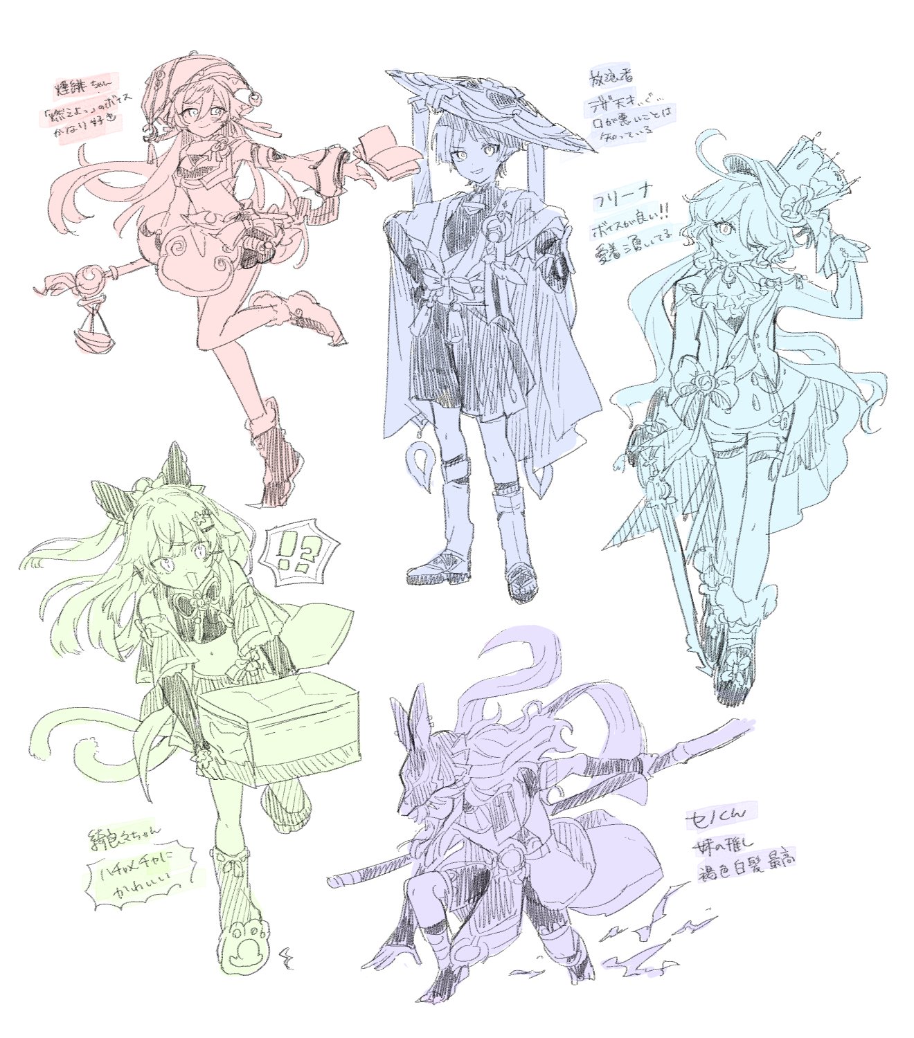 !? 2boys 3girls :3 ahoge animal_ears animal_hands animal_hood arm_at_side armor ascot belt blunt_ends bodysuit book bow bra bridal_gauntlets cape cat_paws cat_tail character_name closed_mouth crop_top crossed_bangs cyno_(genshin_impact) detached_sleeves elbow_gloves feathers floating floating_book floating_object foot_up footwear_bow frilled_footwear full_body fur-trimmed_socks furina_(genshin_impact) furisode gem genshin_impact gloves hair_between_eyes hair_bow hakama hakama_shorts han'eri hand_on_own_head hand_on_own_hip hat hat_bow hat_tassel hatching_(texture) head_tilt highres holding holding_polearm holding_scale holding_sword holding_weapon hood jackal_ears jacket japanese_armor japanese_clothes jingasa kimono kirara_(genshin_impact) kneehighs kneeling knees kote layered_clothes layered_kimono leg_warmers linear_hatching long_sleeves looking_at_viewer mandarin_collar middle_ring midriff multiple_boys multiple_girls multiple_tails navel one_eye_closed open_clothes open_hand open_jacket open_kimono open_mouth ouji_fashion outstretched_arm partially_colored pelvic_curtain pleated_shorts polearm pom_pom_(clothes) rope sandals scaramouche_(genshin_impact) scarf shoes short_sleeves shorts shoulder_peek skirt smile smirk socks splendor_of_tranquil_waters_(genshin_impact) spoken_interrobang stirrup_legwear sword tail tassel tenpi_(hello_3152) thigh_strap tilted_headwear toeless_legwear tongue tongue_out top_hat translation_request two_tails underwear usekh_collar vest vision_(genshin_impact) wanderer_(genshin_impact) weapon weighing_scale white_background xiezhi_guan yanfei_(genshin_impact) zouri