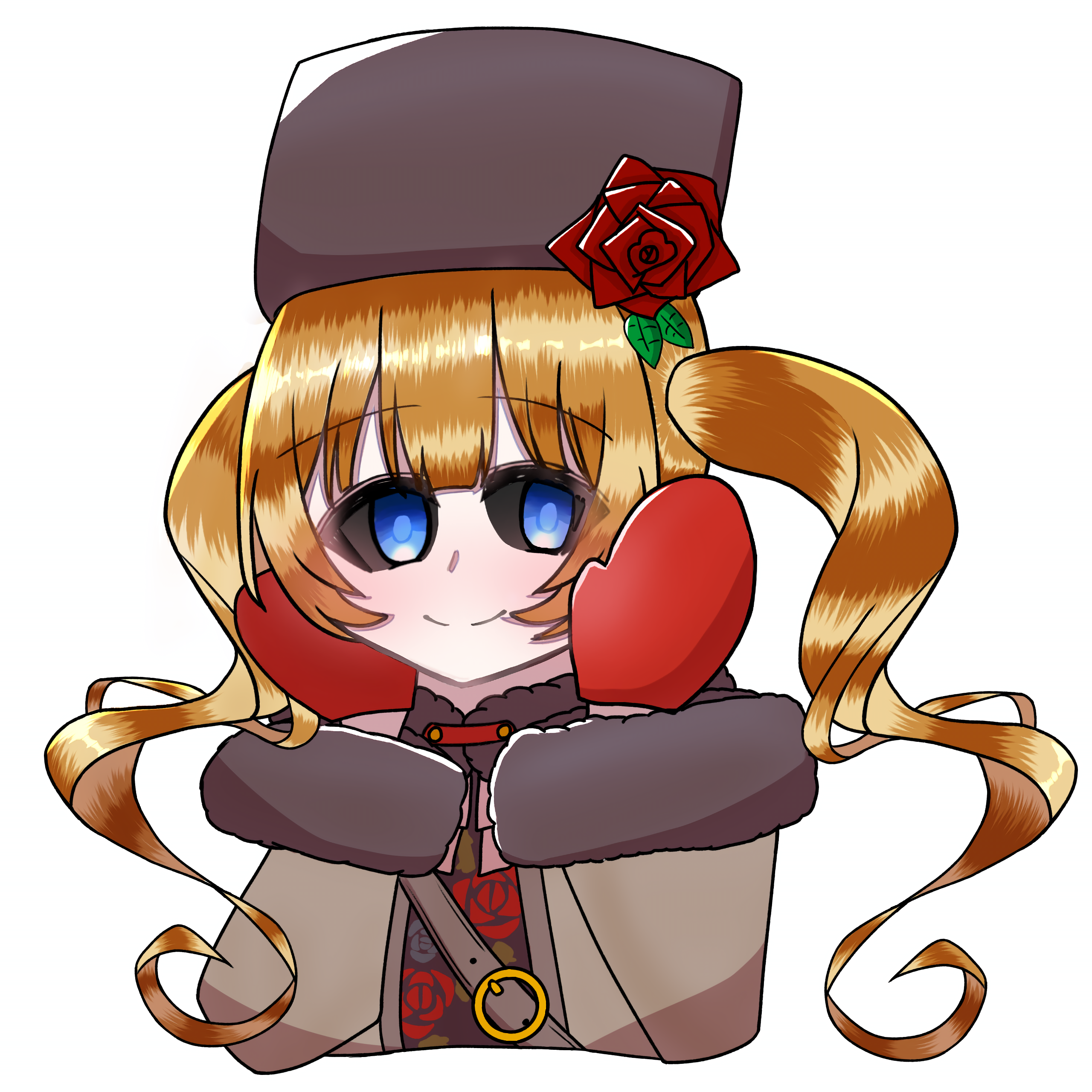 1girl absurdres belt black_hat black_sclera blue_eyes brown_coat buckle coat colored_sclera flower fur_trim grimms_echoes hands_up hat highres long_hair orange_hair red_flower red_rose rose simple_background smile solo source_request tense_p_sandes twintails upper_body void_gerda_(grimms_echoes) white_background
