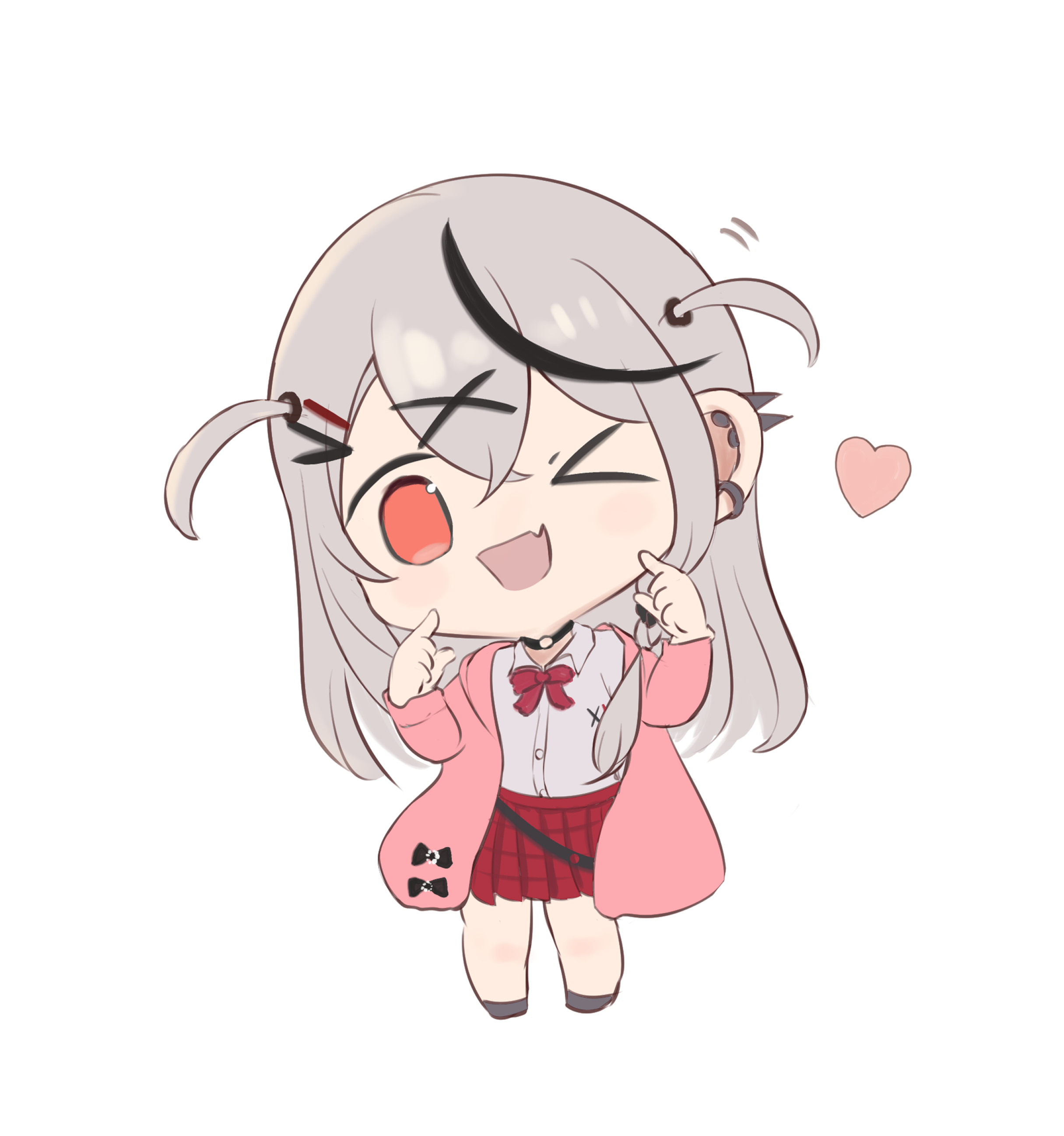 1girl absurdres black_choker black_hair black_shoes chibi choker collared_shirt ear_piercing fang grey_hair hair_ornament hairpin heart highres hololive jacket looking_at_viewer multicolored_hair o-ring o-ring_choker official_alternate_costume one_eye_closed open_mouth piercing pink_jacket red_eyes red_skirt ri_shan sakamata_chloe sakamata_chloe_(gyarumata) shirt shoes skin_fang skirt smile solo streaked_hair virtual_youtuber x_hair_ornament
