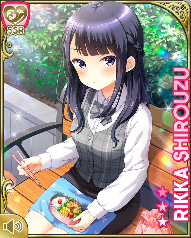 1girl :o bare_legs bento black_hair black_skirt blush bow bowtie braid breasts card_(medium) character_name chopsticks closed_mouth girlfriend_(kari) grey_bow grey_vest long_hair medium_hair office_lady official_art outdoors park pencil_skirt plaid_bow plaid_clothes plaid_vest purple_eyes qp:flapper shirouzu_rikka shirt sitting skirt small_breasts solo tagme uneven_bangs vest white_shirt