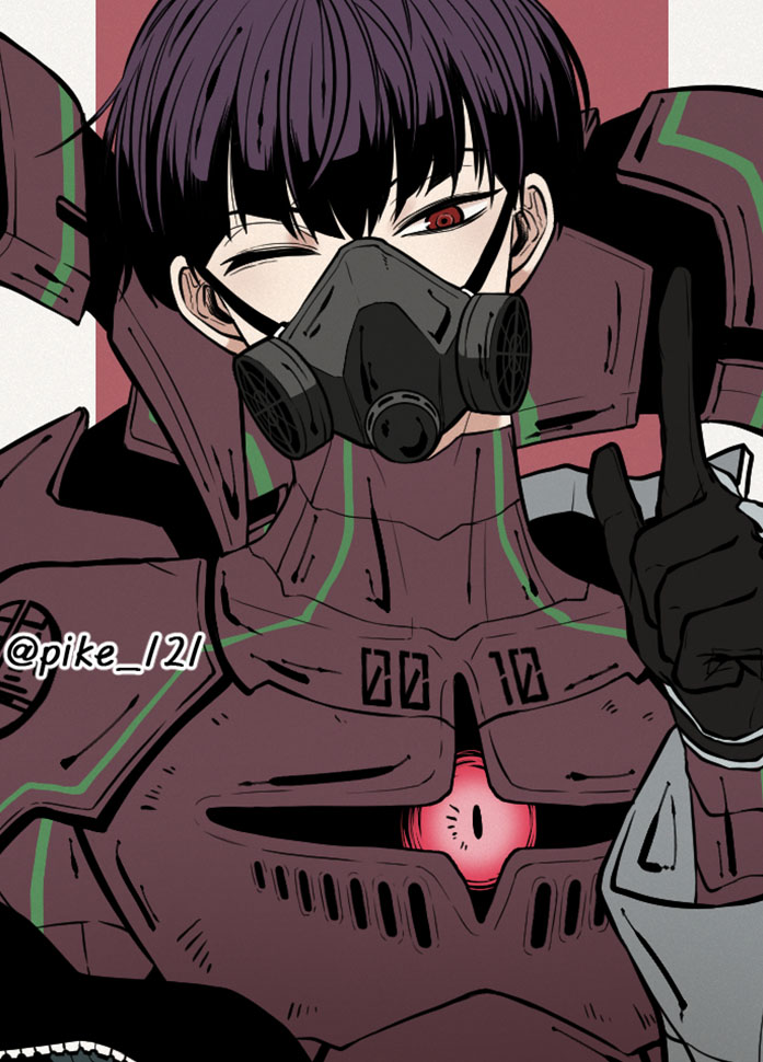 1boy armor black_hair gas_mask gloves hoshina_soshiro kaijuu_no._8 male_focus mask one_eye_closed pkkjn8 red_eyes simple_background upper_body
