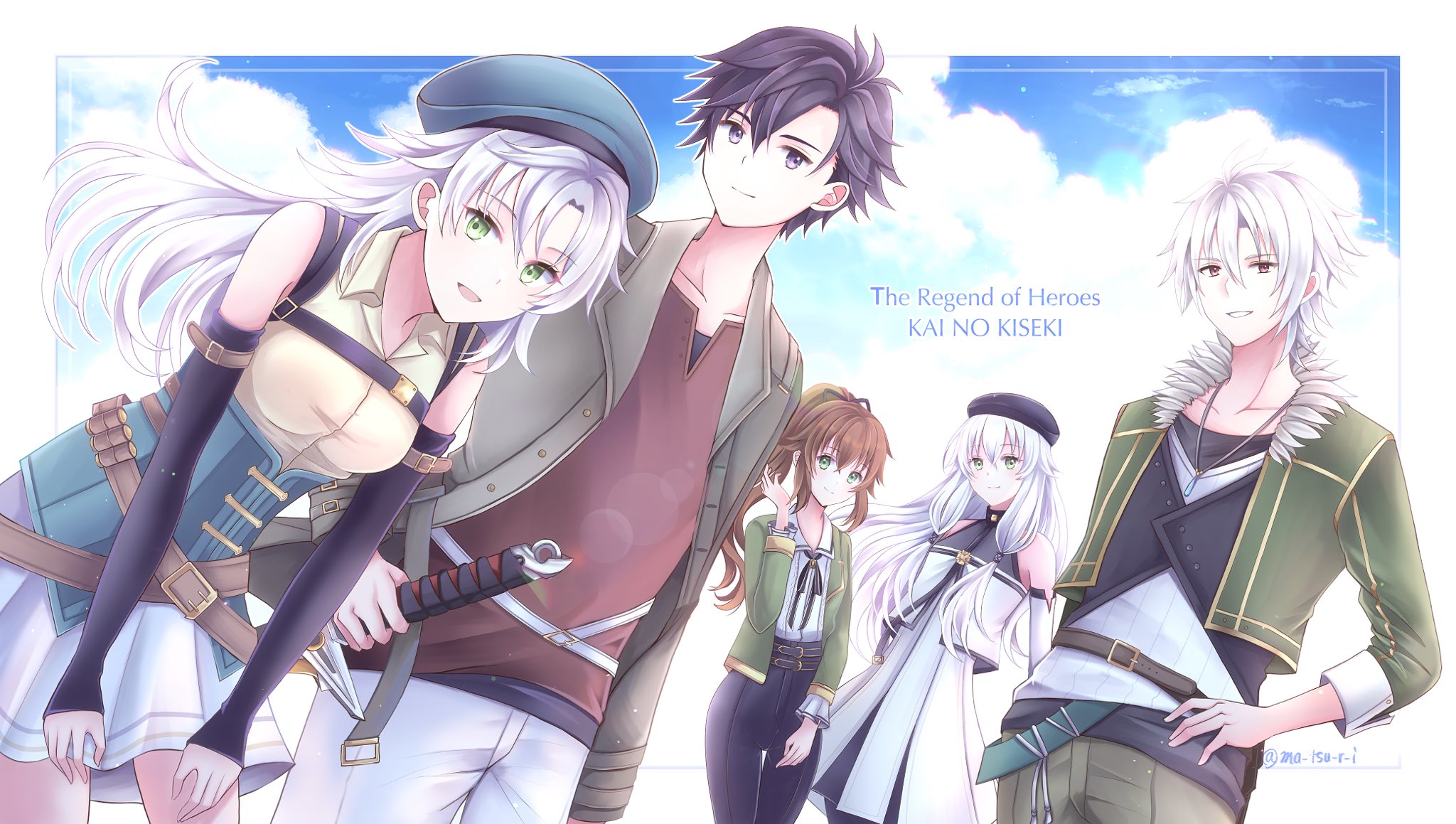 2boys 3girls altina_orion belt beret black_hat black_pants blue_hair blue_hat blue_sky border brown_hair closed_mouth cloud coat commentary_request copyright_name crow_armbrust eiyuu_densetsu fie_claussell formal_clothes fur-trimmed_jacket fur_trim green_eyes green_jacket green_suit grey_coat hand_on_own_hip hat high-waist_pants highres jacket kai_no_kiseki kuro_no_kiseki_(series) long_hair looking_at_viewer ma_tsu_r_i multiple_boys multiple_girls open_clothes open_jacket open_mouth outside_border pants purple_eyes rean_schwarzer red_shirt shirt short_hair sky smile standing suit towa_herschel white_border white_hair white_pants