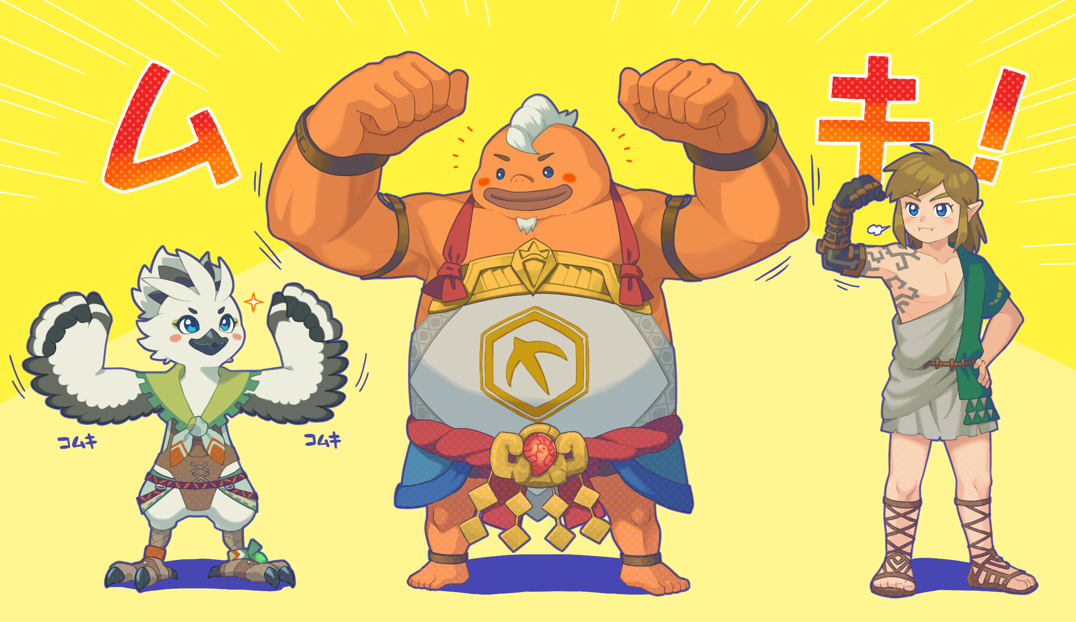 3boys archaic_set_(zelda) beak bird_boy blue_eyes blush_stickers facial_hair feathers flexible goatee goron grey_hair highres link multiple_boys muscular muscular_male nintendo pointy_ears rito sandals souko_(kuyugiri) standing talons the_legend_of_zelda the_legend_of_zelda:_tears_of_the_kingdom tulin_(zelda) white_feathers winged_arms wings yunobo