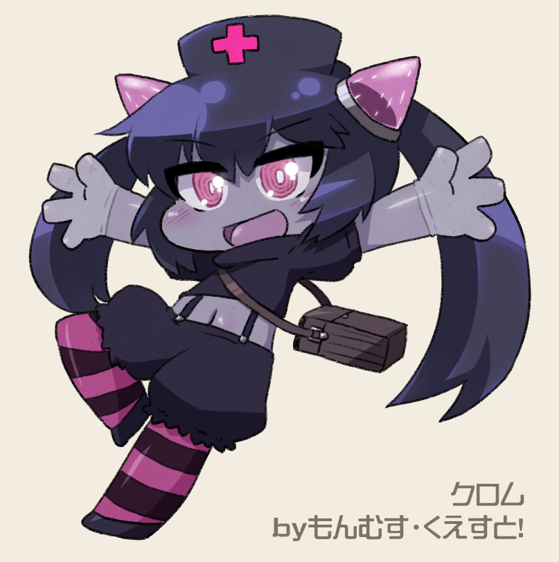 1girl :d bag black_hair black_shirt black_shoes brown_bag character_name chibi chibi_only chrome_(mon-musu_quest!) colored_skin commentary_request copyright_name crop_top cross demon_girl fewer_digits full_body gloves grey_skin hat horizontal-striped_thighhighs horns ikuwiron light_blush long_hair midriff mon-musu_quest! navel nurse_cap open_mouth pink_eyes pink_horns pink_thighhighs puffy_short_sleeves puffy_sleeves purple_thighhighs red_cross ringed_eyes rubber_gloves shirt shoes short_sleeves shorts shoulder_bag simple_background smile striped_clothes striped_thighhighs suspender_shorts suspenders thighhighs translated twintails v-shaped_eyebrows very_long_hair white_background