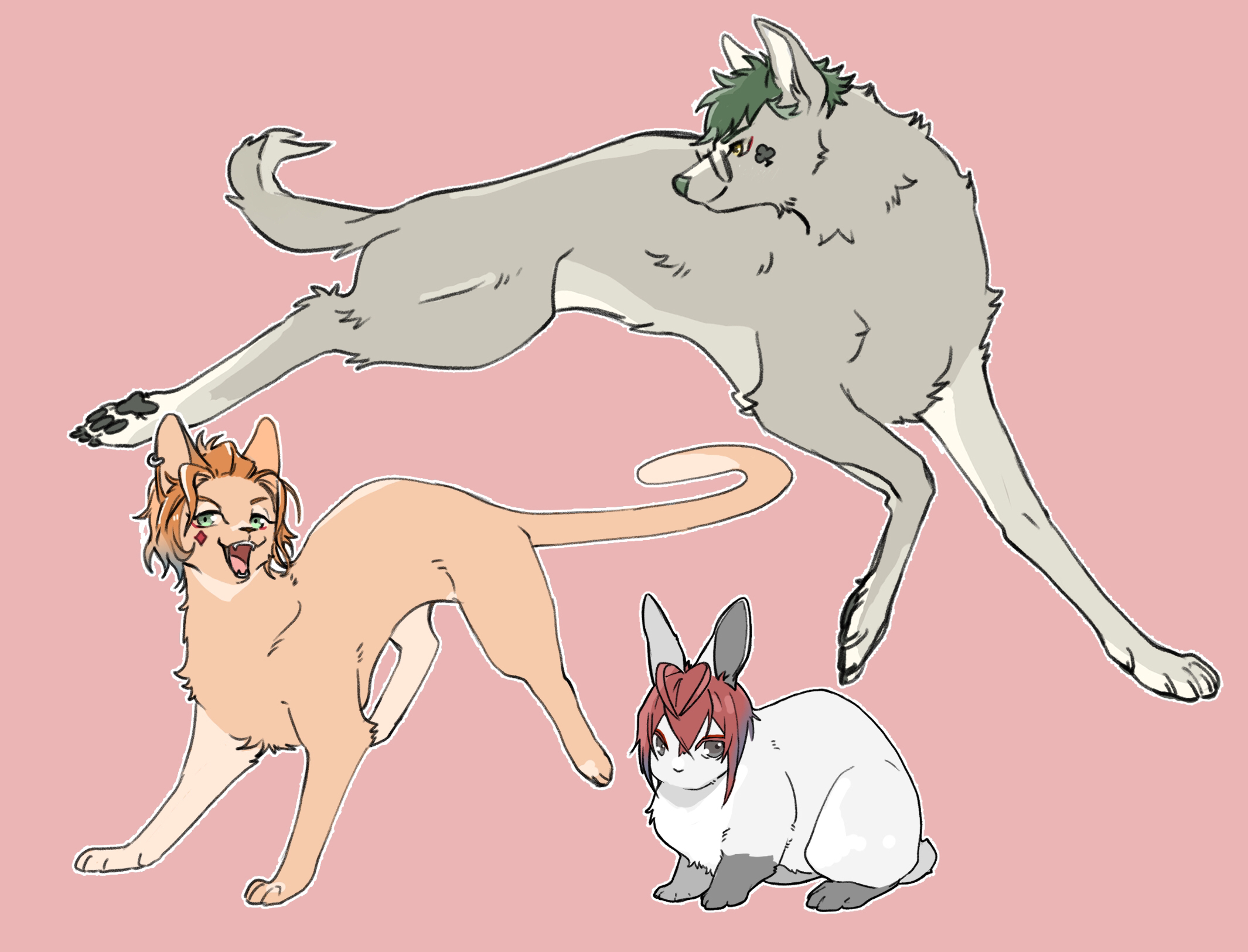 animal animal_focus animalization cat cater_diamond commentary_request dog green_hair highres no_humans orange_hair pink_background rabbit raccoonlot red_hair riddle_rosehearts short_hair simple_background trey_clover twisted_wonderland