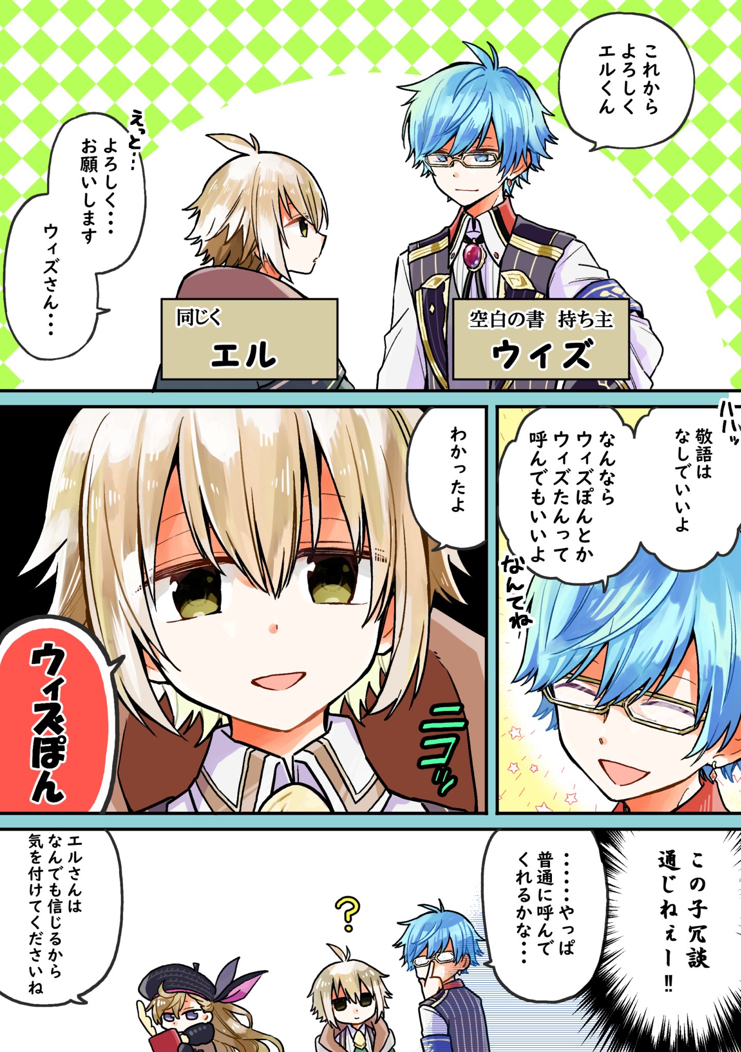 1girl 2boys 4koma ? adjusting_eyewear black_hat blonde_hair blue_eyes blue_hair character_name comic el_(grimms_echoes) grimms_echoes guest_art hat highres jibril_(grimms_echoes) kobayashi_kina long_hair multiple_boys open_mouth purple_eyes short_hair smile speech_bubble translation_request wiz_(grimms_echoes)