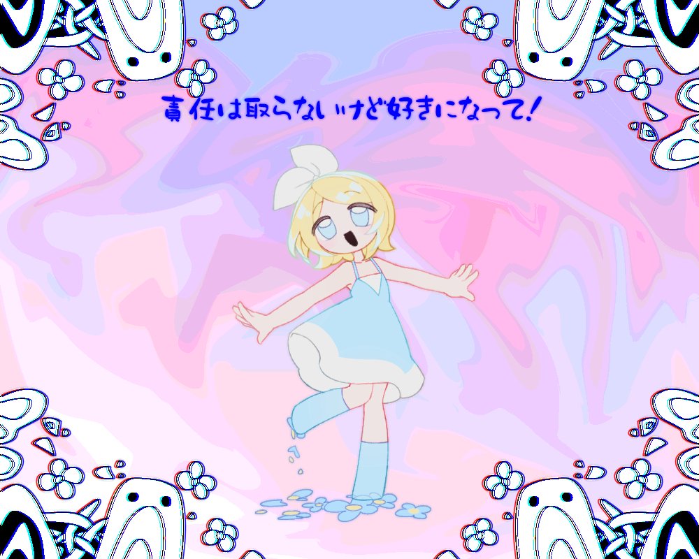 1girl abstract_background angeng blonde_hair blue_dress blue_eyes blue_flower blue_socks bow chromatic_aberration commentary_request dress flower flower_symbol full_body hair_bow kagamine_rin kneehighs kyoufu!_hatan!_bouryokusei!_(vocaloid) looking_at_viewer lyrics multicolored_background open_mouth outstretched_arms pink_background purple_background short_hair sleeveless sleeveless_dress smile socks solo spaghetti_strap spread_arms standing standing_on_one_leg translation_request vocaloid white_bow