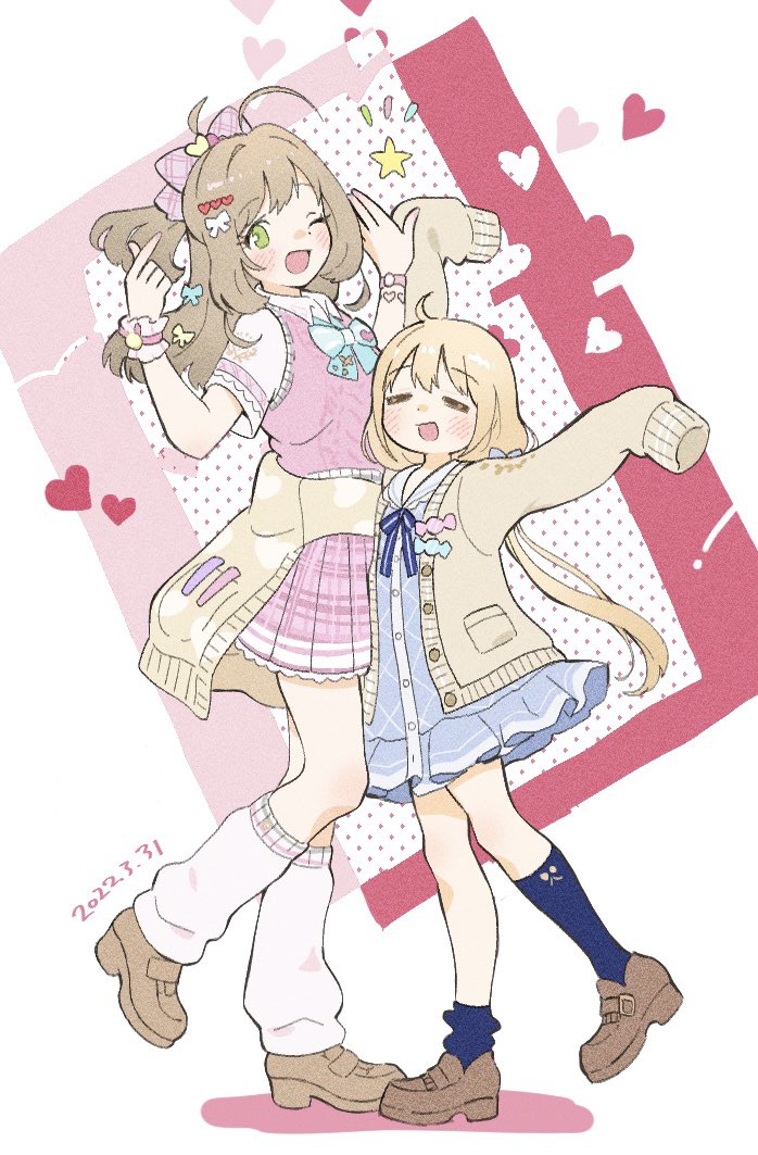 2girls =_= age_difference ahoge arm_up blonde_hair blue_bow blue_bowtie blue_dress blue_ribbon blue_socks blush bow bowtie breasts brown_eyes brown_footwear burakku_mutou cardigan clothes_around_waist colored_shadow dated dress finger_heart flat_chest full_body futaba_anzu green_eyes gyaru hair_bow hair_ornament hair_ribbon hands_up heart heart_hair_ornament high_five idolmaster idolmaster_cinderella_girls idolmaster_cinderella_girls_starlight_stage large_breasts loafers long_hair long_sleeves looking_at_viewer loose_socks low_twintails miniskirt multiple_girls neck_ribbon one_eye_closed onee-loli open_cardigan open_clothes open_mouth pink_background pink_ribbon pink_scrunchie pink_sweater_vest plaid_clothes plaid_ribbon plaid_skirt pleated_skirt polka_dot polka_dot_background ribbon sailor_collar sato_shin scrunchie shadow shirt shoes short_sleeves skirt sleeves_past_fingers sleeves_past_wrists smile socks standing standing_on_one_leg star_(symbol) sweater_vest twintails two-tone_background very_long_hair watch white_background white_ribbon white_sailor_collar white_shirt white_socks wrist_scrunchie wristwatch yellow_cardigan yellow_ribbon