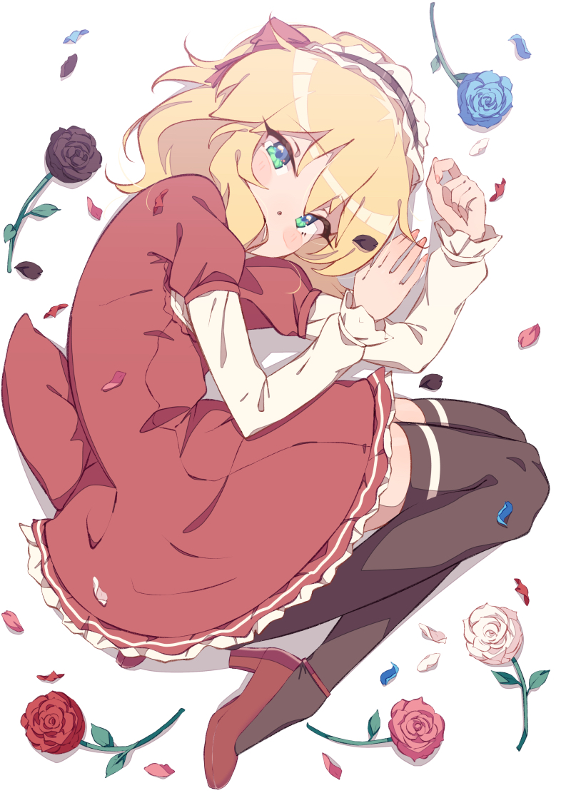 black_thighhighs blonde_hair blush commentary_request dress flower frilled_hairband frills full_body green_eyes hairband idolmaster idolmaster_cinderella_girls kyou_(kyo_u) legs_folded looking_at_viewer lying on_side petals red_dress red_shorts rose sakurai_momoka shorts thighhighs zettai_ryouiki