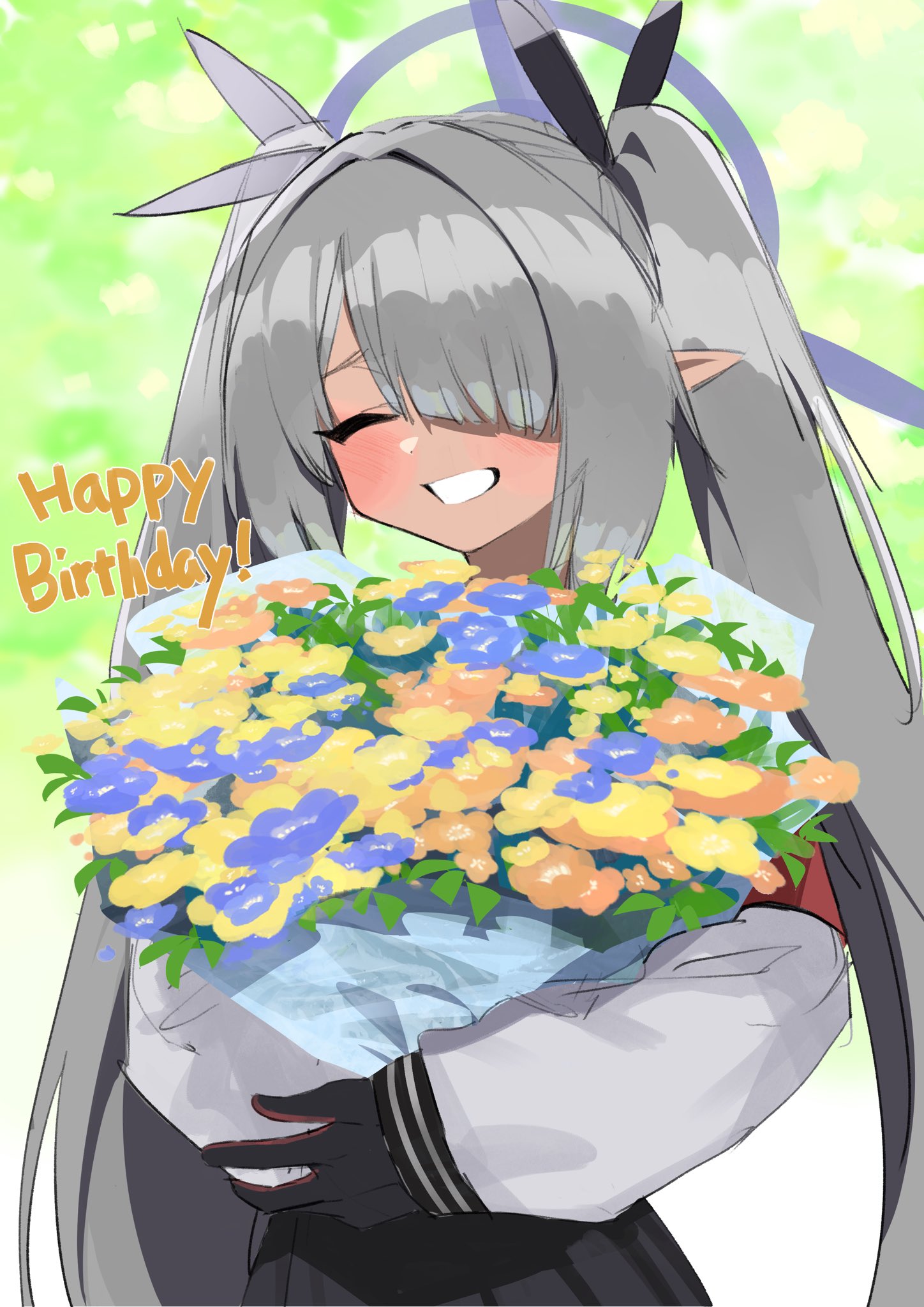 1girl aji_aji_nori armband birthday black_gloves black_skirt blue_archive blue_flower blush bouquet closed_eyes commentary dark-skinned_female dark_skin flower gloves grey_hair grin hair_over_one_eye hair_ribbon halo happy_birthday highres holding holding_bouquet iori_(blue_archive) long_hair long_sleeves orange_flower pointy_ears red_armband ribbon sidelocks simple_background skirt smile solo untranslatable_commentary twintails yellow_flower