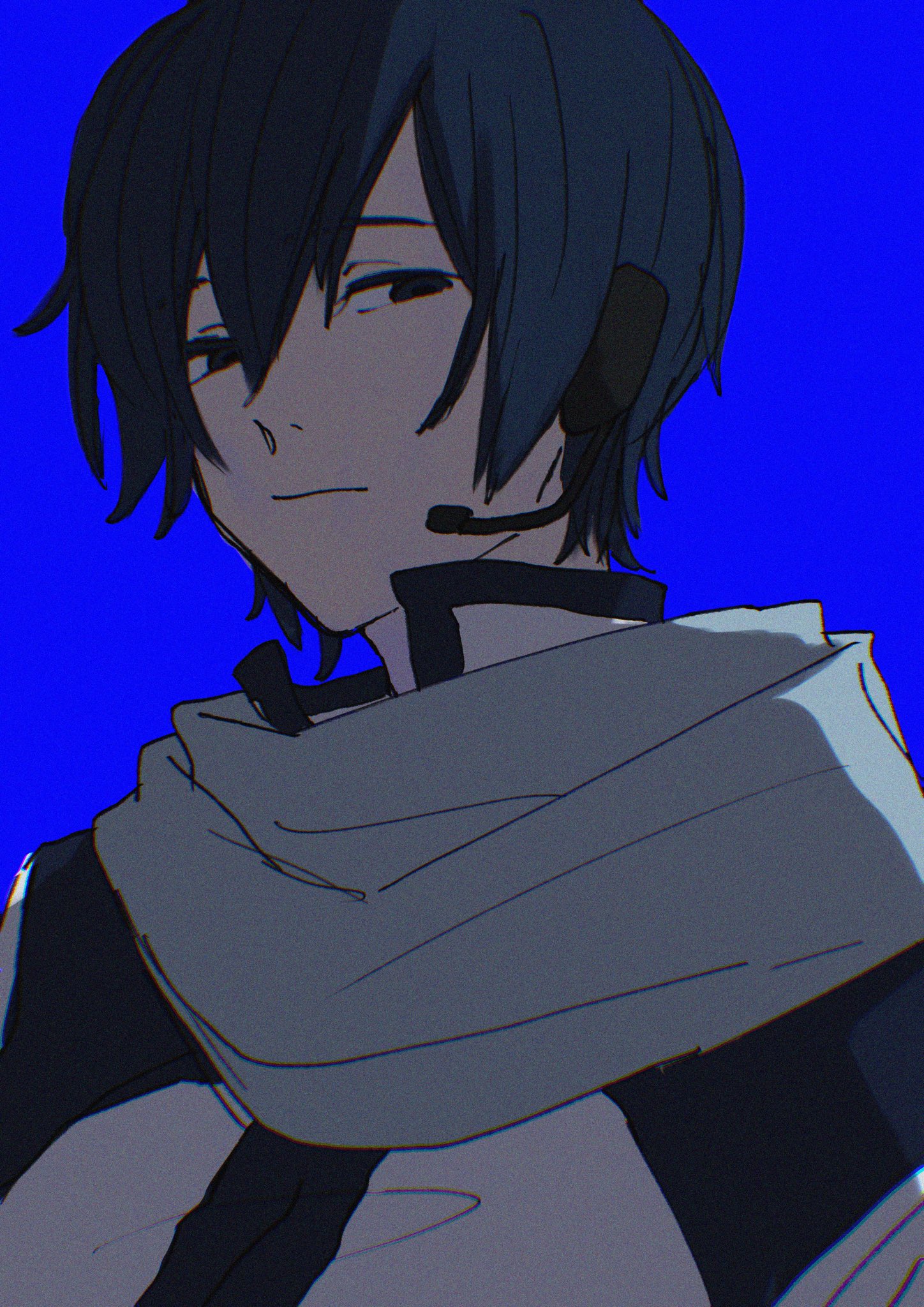 1boy blue_background blue_hair blue_scarf closed_mouth commentary_request dark_blue_hair hair_between_eyes headset highres kaito_(vocaloid) looking_to_the_side madoi_io male_focus popped_collar scarf short_hair sideways_glance simple_background solo upper_body vocaloid