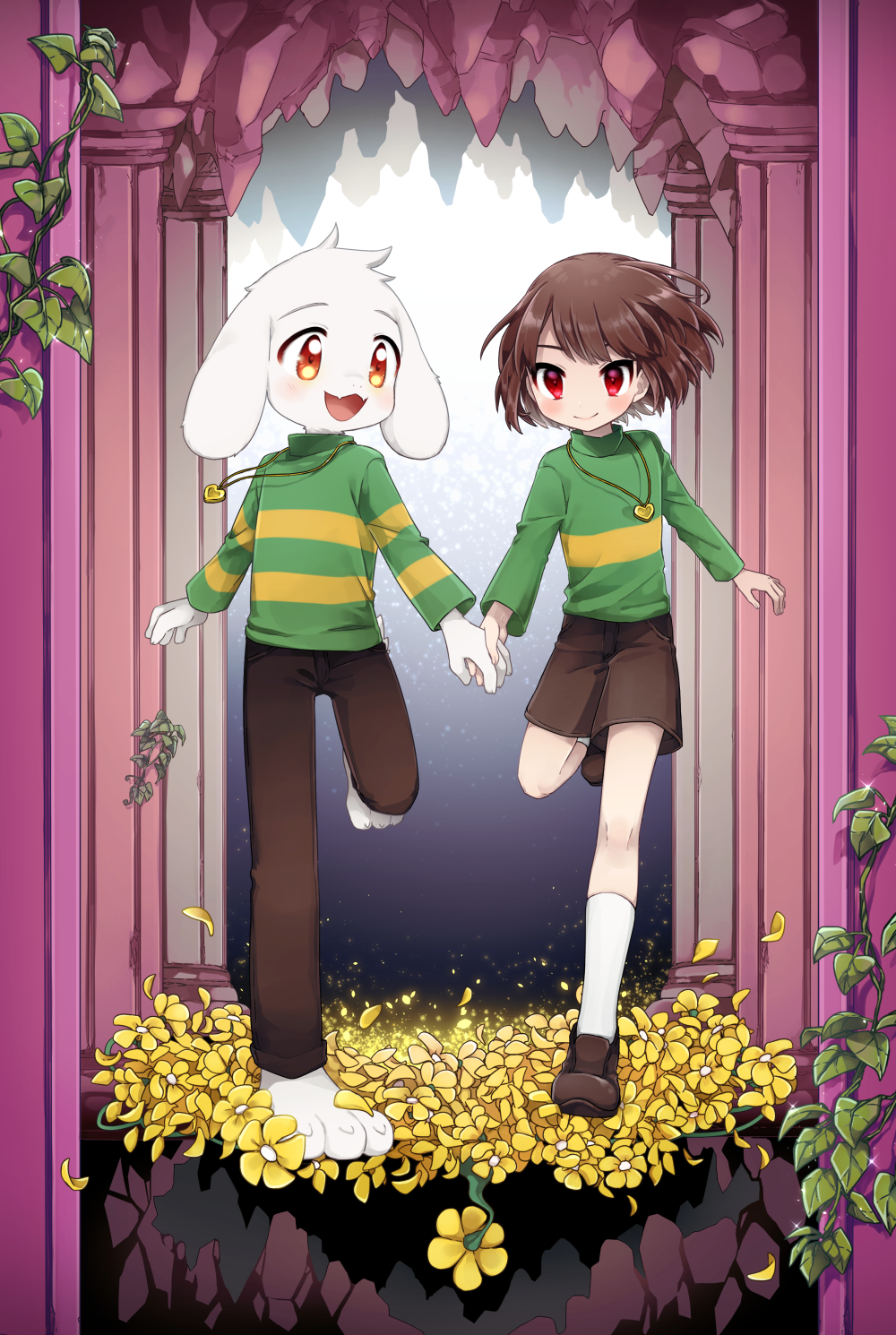 1boy 1other :3 animal_ears asriel_dreemurr barefoot blush brown_footwear brown_hair brown_pants brown_shorts chara_(undertale) closed_mouth commentary_request fangs fewer_digits field fingernails flower flower_field full_body furry furry_male goat_boy goat_ears green_sweater heart heart_necklace highres holding_hands jewelry kneehighs leaf leftporygon loafers necklace open_mouth orange_eyes pants plant red_eyes shoes short_hair shorts skin_fangs smile socks standing standing_on_one_leg striped_clothes striped_sweater sweater tongue turtleneck turtleneck_sweater two-tone_sweater undertale utdr_(toby_fox) vines white_socks yellow_flower yellow_sweater