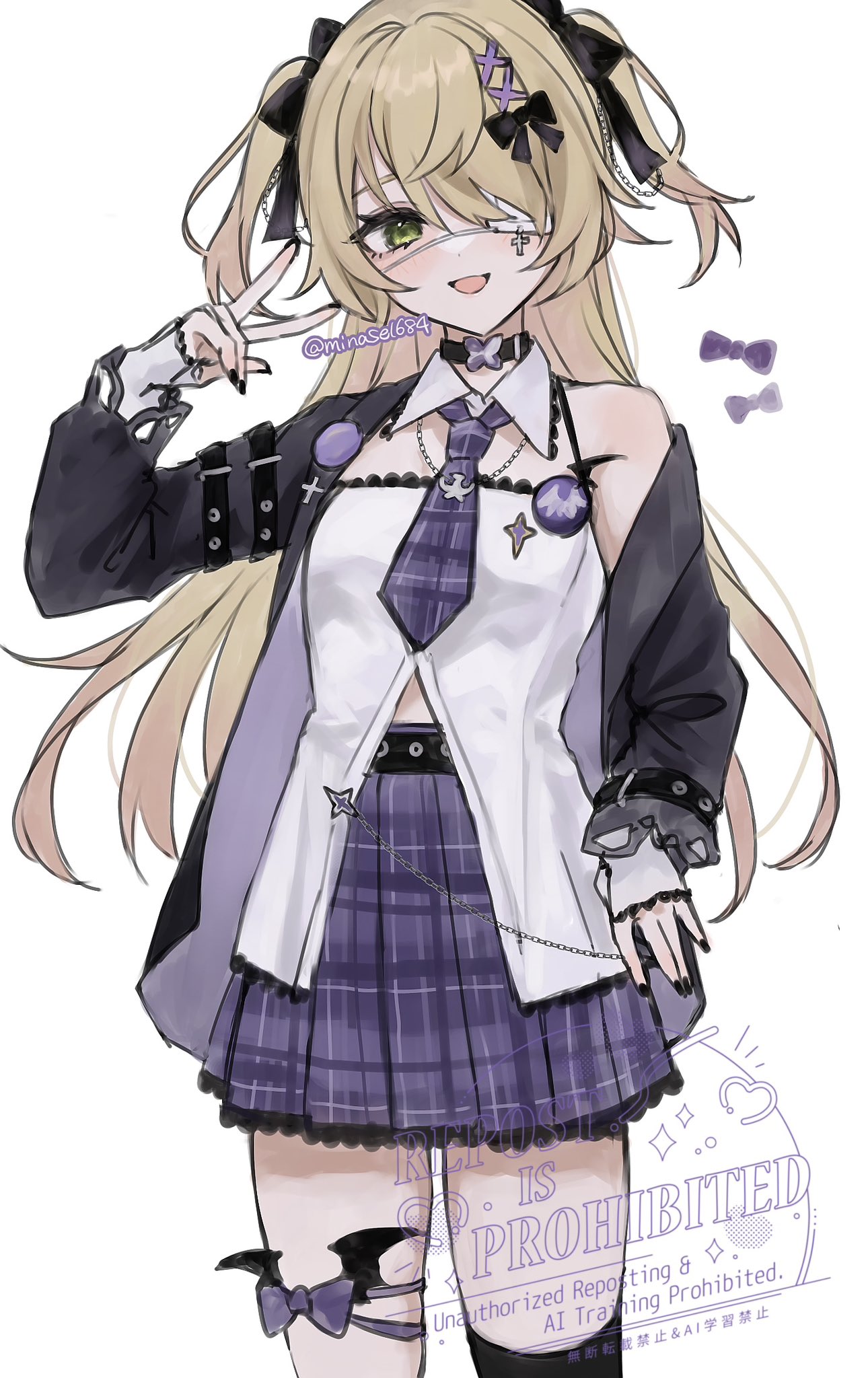 1girl black_bow black_jacket black_thighhighs blonde_hair bow eyepatch fischl_(genshin_cafe_in_seoul)_(genshin_impact) fischl_(genshin_impact) genshin_impact green_eyes hair_bow highres jacket long_sleeves looking_at_viewer maguro_(minase1684) official_alternate_costume open_clothes open_jacket open_mouth shirt simple_background smile solo standing thighhighs two_side_up white_background white_shirt