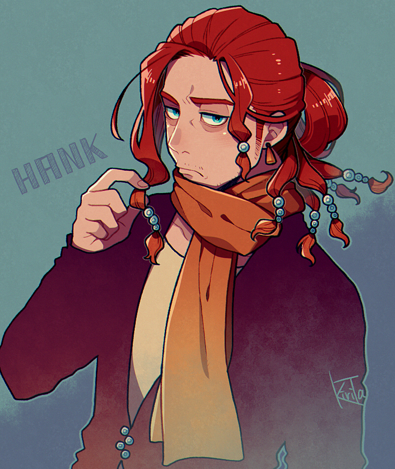 1boy animification beads blue_background blue_eyes character_name closed_mouth earrings facial_hair finding_dory hair_beads hair_ornament hank_(finding_dory) jacket jewelry kiri_futoshi long_sideburns male_focus mustache_stubble orange_scarf personification ponytail red_hair red_jacket scarf shirt sideburns solo stubble white_shirt